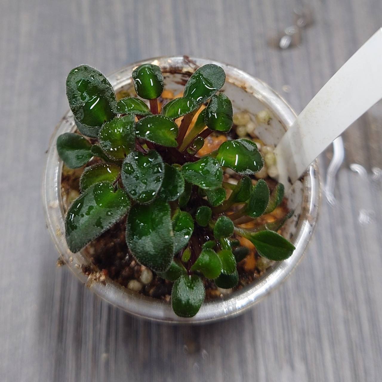 セントポーリア タイニーブッパは、葉・株ともに小型でまとまりやすいタイプのセントポーリアです。葉は丸みがあり、やや厚みのある質感で、全体として愛らしく落ち着いた印象を持ちます。