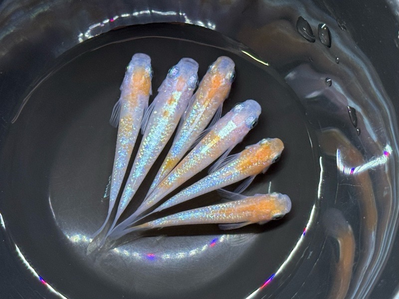 ラメの輝きと淡く差し込むオレンジ色が美しく調和した、上品さ際立つメダカ品種です。