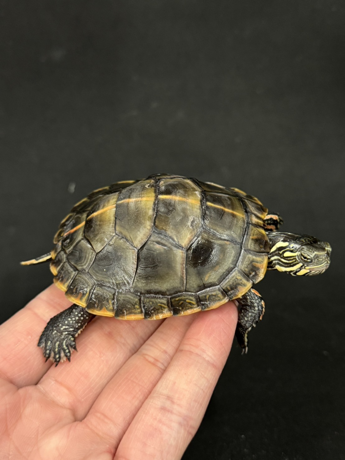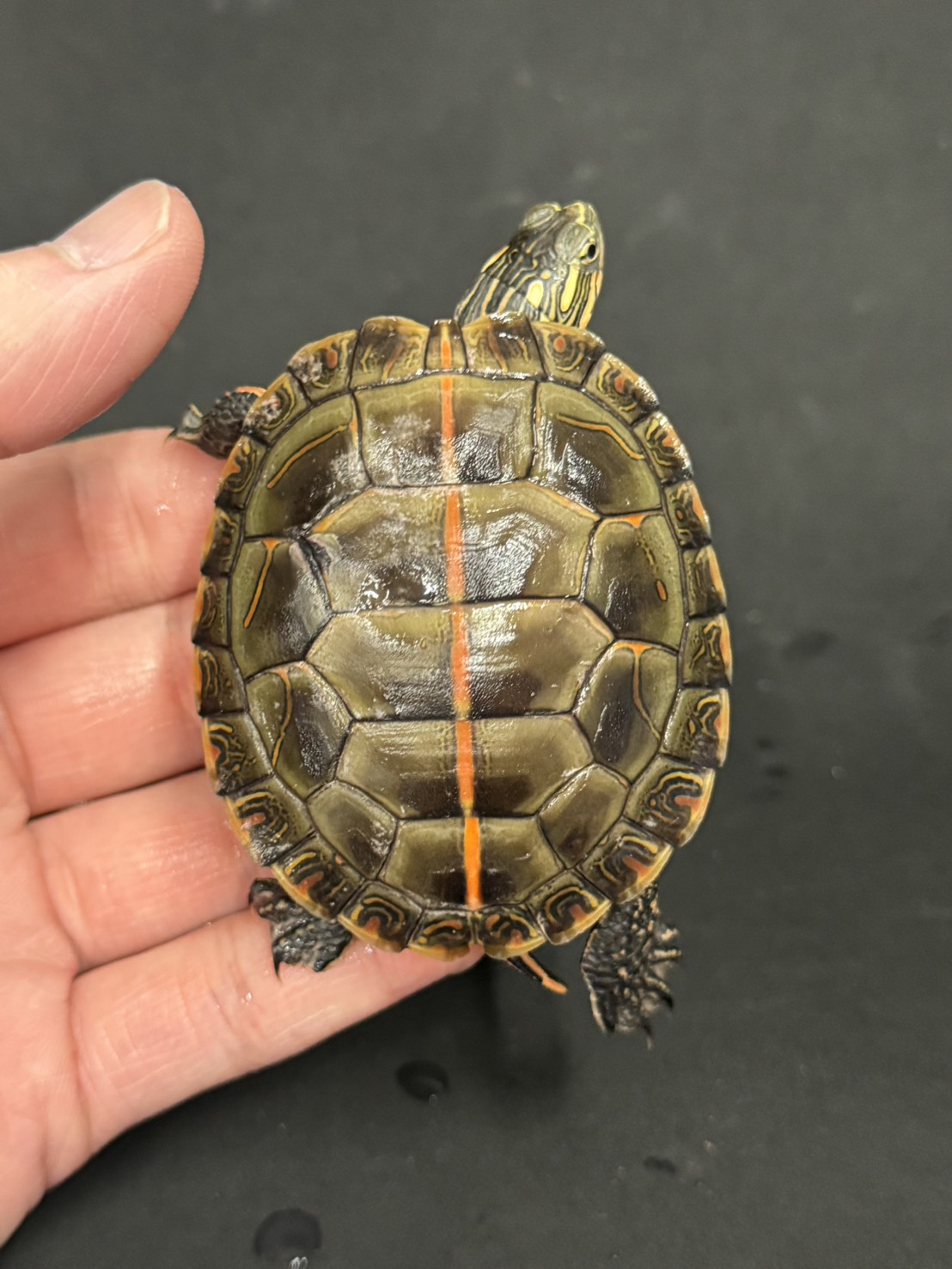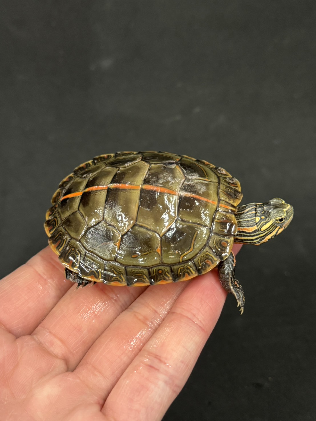 甲羅に走る赤みのあるラインが印象的で、落ち着いた配色の中にさりげない個性が感じられるタイプです。体格は比較的コンパクトで、水中では安定した泳ぎを見せ、物陰で静かに過ごす様子も観察できます。環境に慣れると行動は穏やかで、観賞向きの落ち着いた魅力があります。