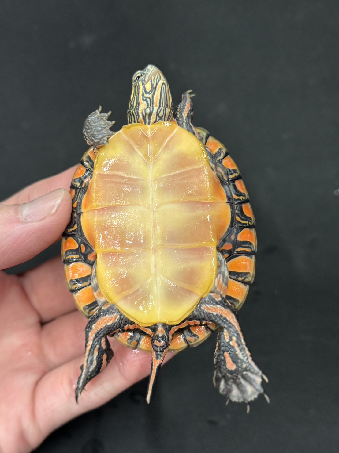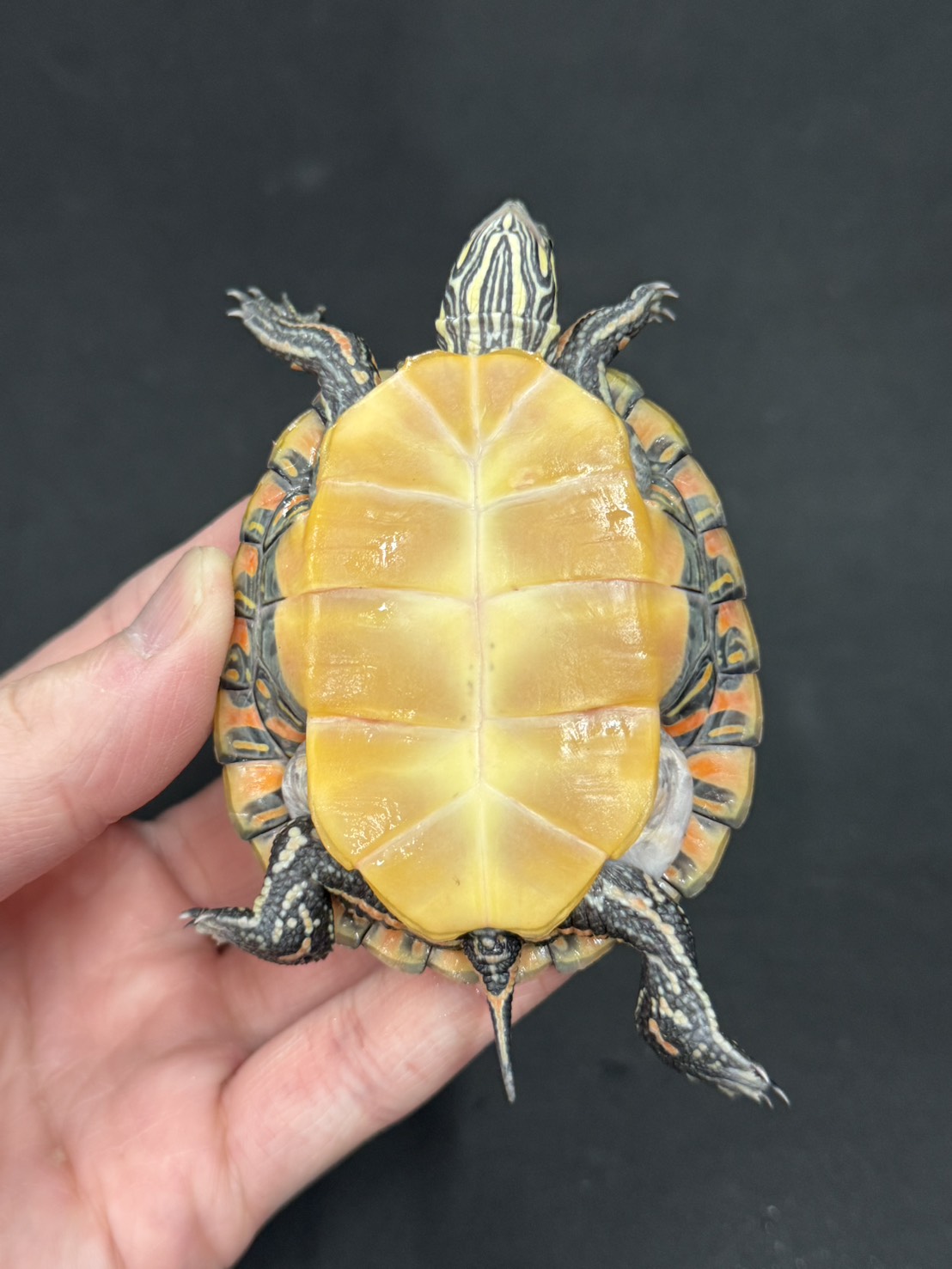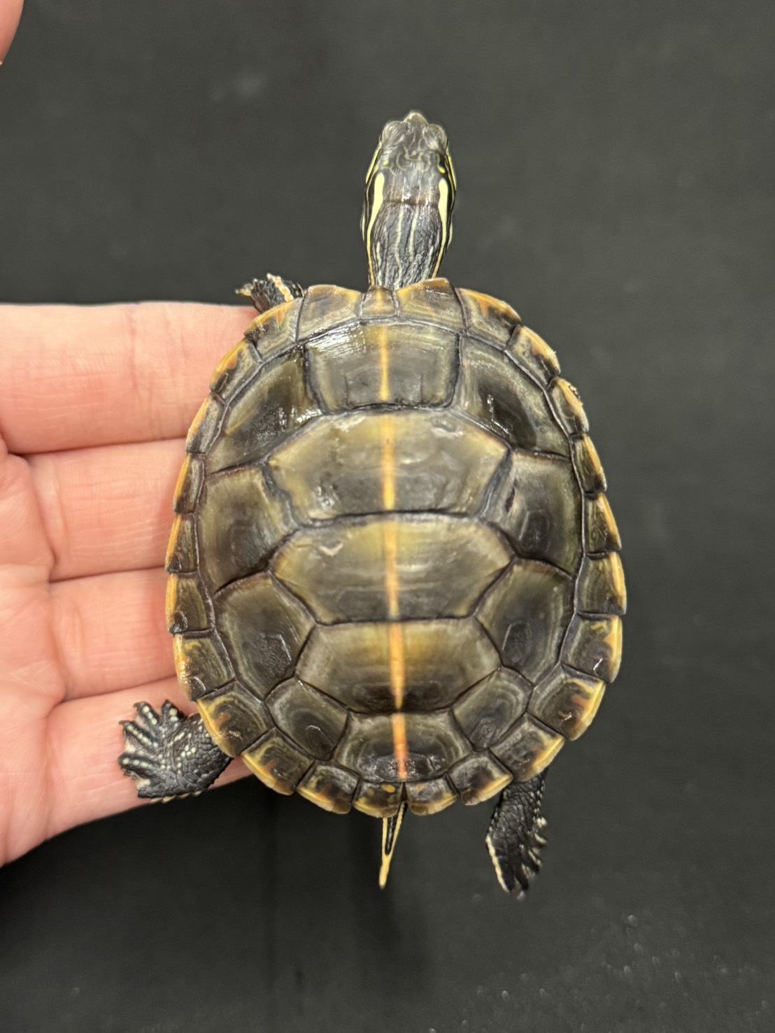 甲羅に走る赤みのあるラインが印象的で、落ち着いた配色の中にさりげない個性が感じられるタイプです。体格は比較的コンパクトで、水中では安定した泳ぎを見せ、物陰で静かに過ごす様子も観察できます。環境に慣れると行動は穏やかで、観賞向きの落ち着いた魅力があります。
