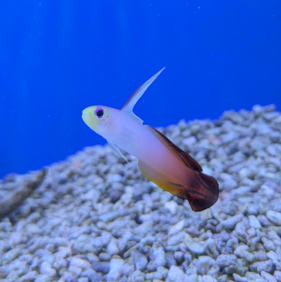 白い体に伸びる背ビレが美しいハタタテハゼ。
