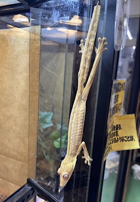独特すぎる体型と存在感、名前の通り筋状に走る模様と、とても細長いシルエットが強烈な印象を残す、スジヘラオヤモリです。
