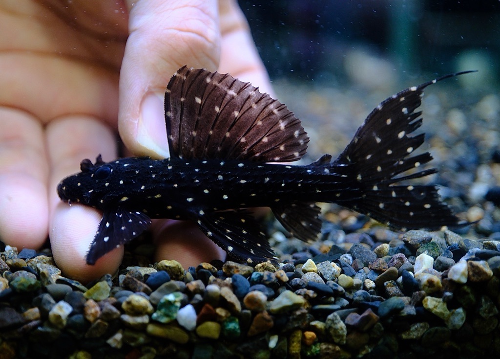 漆黒のボディに散りばめられた細かなスポット、そして鋭く立ち上がる背ビレと尾ビレ。
