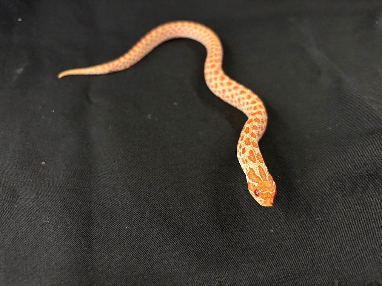 明るく澄んだオレンジカラーがひと目で印象に残る、日本CBのセイブシシバナヘビ アルビノhetスノーのメス個体です。幼体ながら体つきはしっかりしており、写真からも分かる通り発色が非常に良く、今後の成長とともにさらに色味の深みが期待できます。シシバナヘビ特有の愛らしい吻先と穏やかな雰囲気も魅力で、初めての方からコレクション目的の方まで幅広くおすすめできます。
