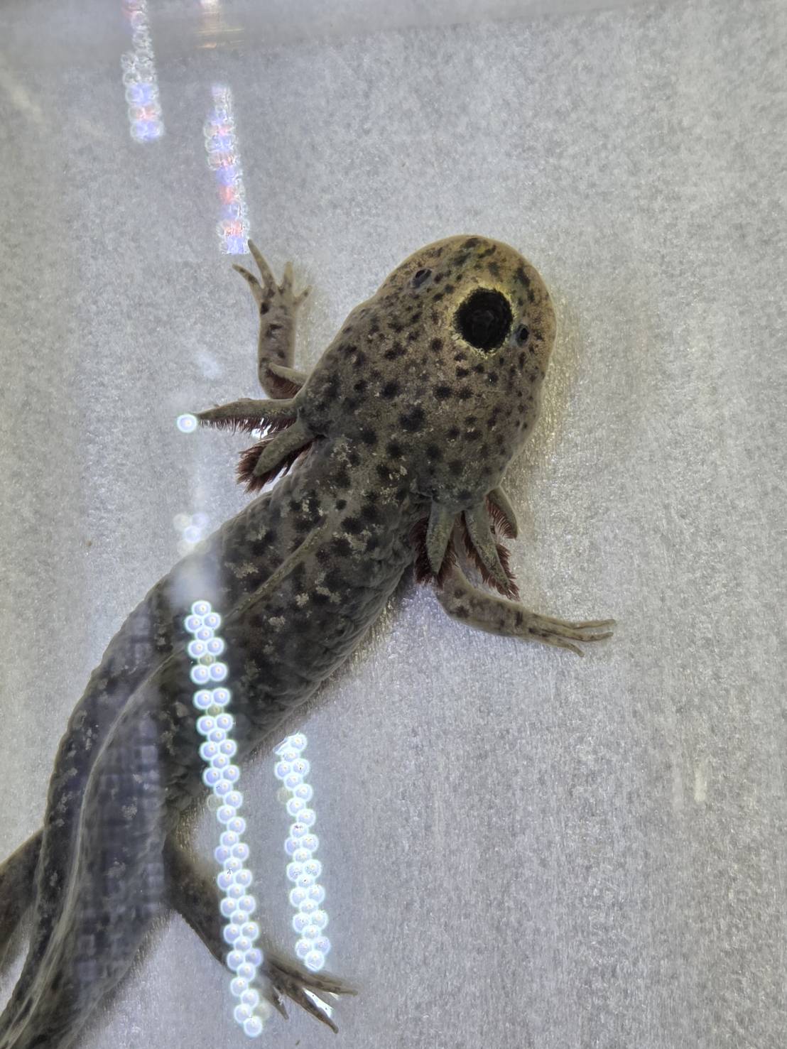 黒と白がまだらに混じる独特な模様が魅力のウーパールーパー マーブル。個体ごとに模様の入り方が異なり、同じ柄はほとんど存在しません。成長とともに色のコントラストがはっきりすることもあり、観察する楽しみがある品種です。