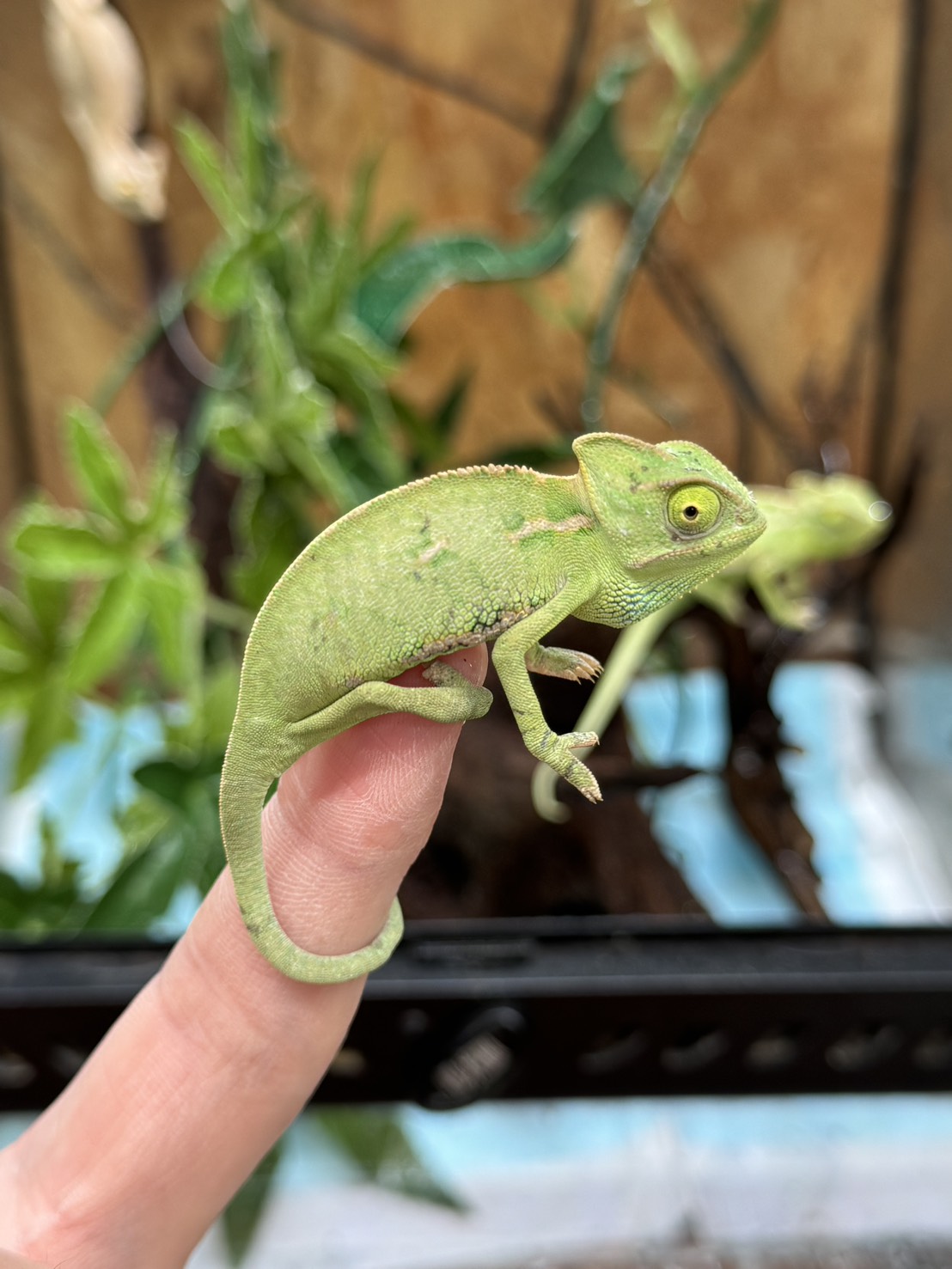 高く伸びた頭部のクレストが特徴的なエボシカメレオン。まるで王冠をかぶったかのような独特のシルエットは存在感があり、カメレオンの中でも特に人気の高い種類です。鮮やかなグリーンを基調とした体色は環境や感情によって変化し、その表情の違いを観察する楽しみがあります。