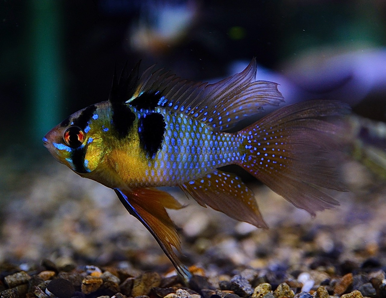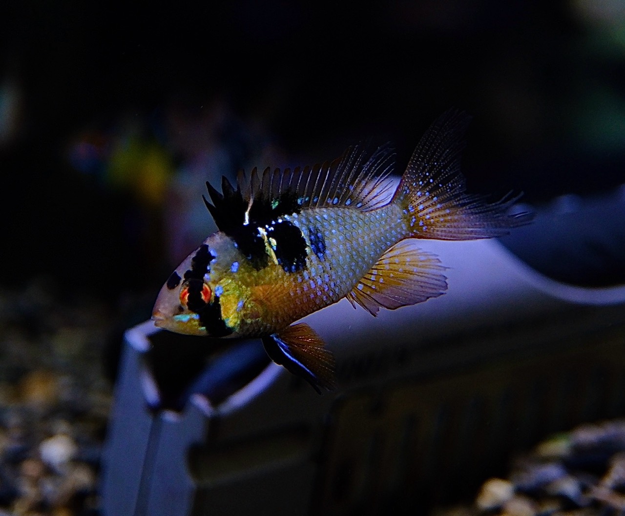 特にロングフィンならではの優雅なヒレの広がりは圧巻。ヒレに入るブルーの細かなスポットが光を受けてきらめき、通常個体とは一線を画す華やかさがあります。