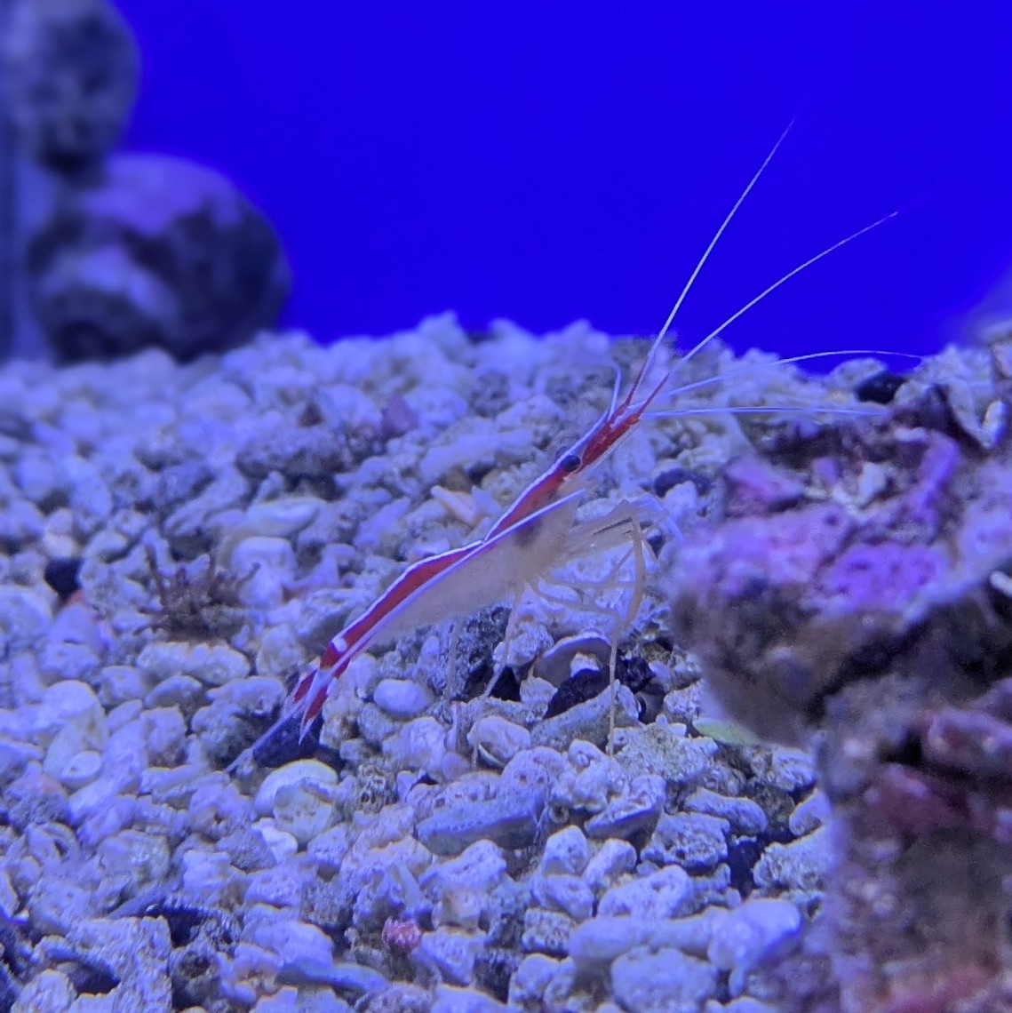 鮮やかな赤いボディに背中を走る一本の白いライン。 海水水槽で人気のクリーナーシュリンプです。