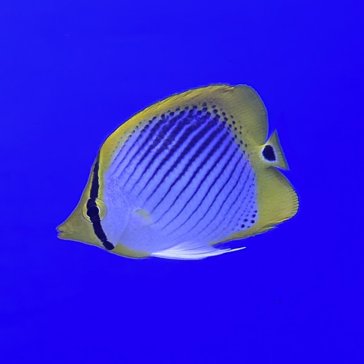 鮮やかなイエローボディに、尾びれの黒いスポットが映えるチョウチョウウオ。 小さめサイズでも存在感はしっかり、水槽を明るく彩ります。