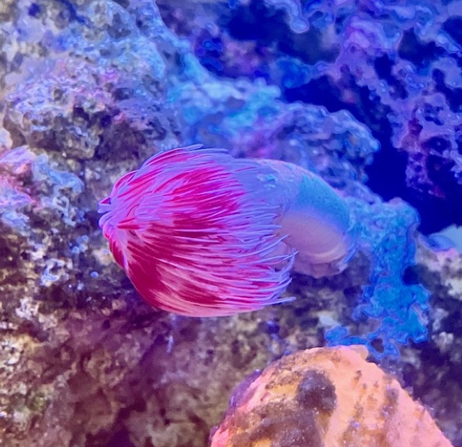 紅白のコントラストが美しいハードチューブです。現在の体長は約13cmで、存在感のあるサイズ感。ライブロック周辺に設置することで水槽のアクセントとして映える個体です。