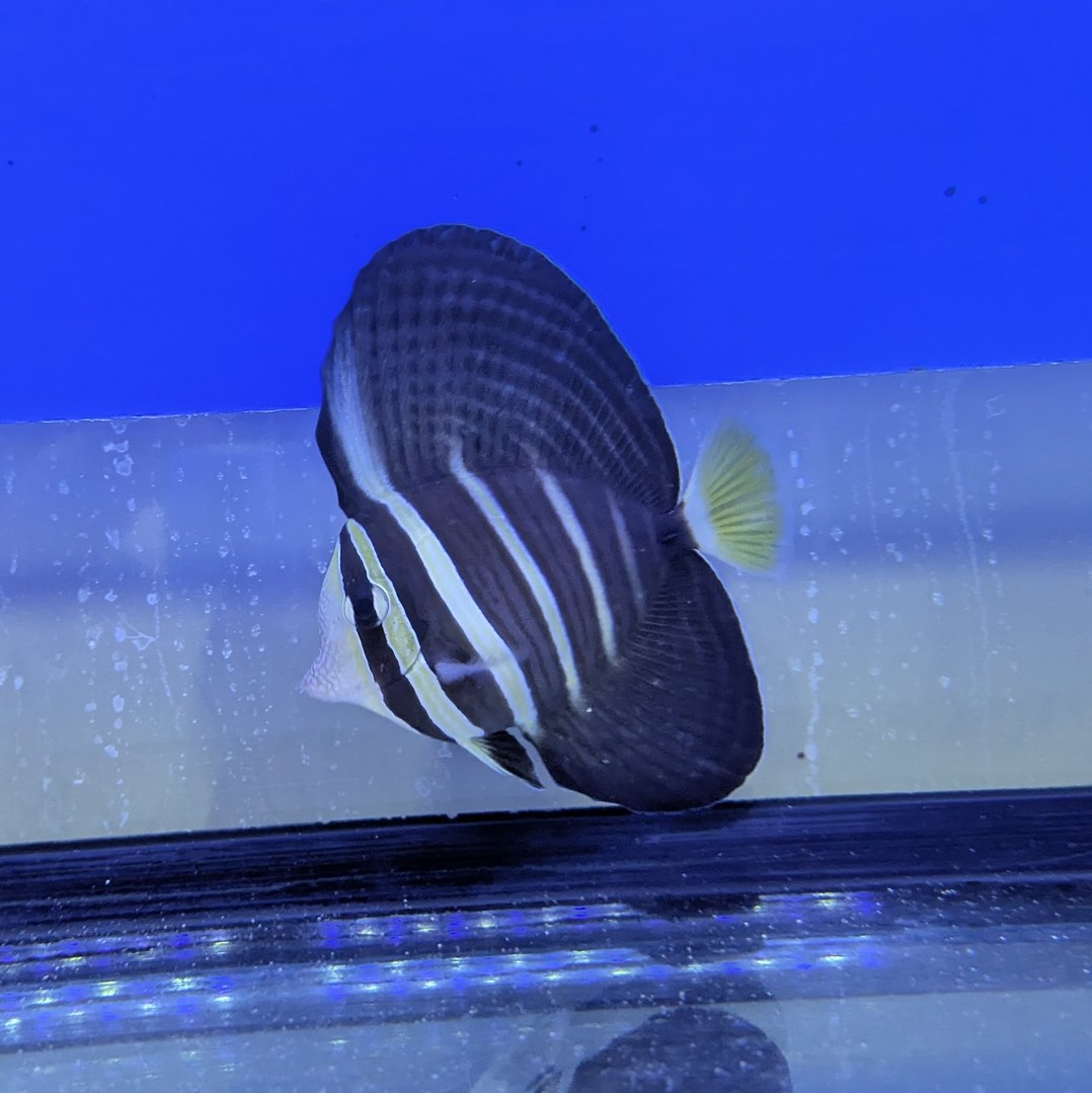 ダークブラウンのボディに走るホワイトライン、そして差し色のような尾ビレのイエロー。