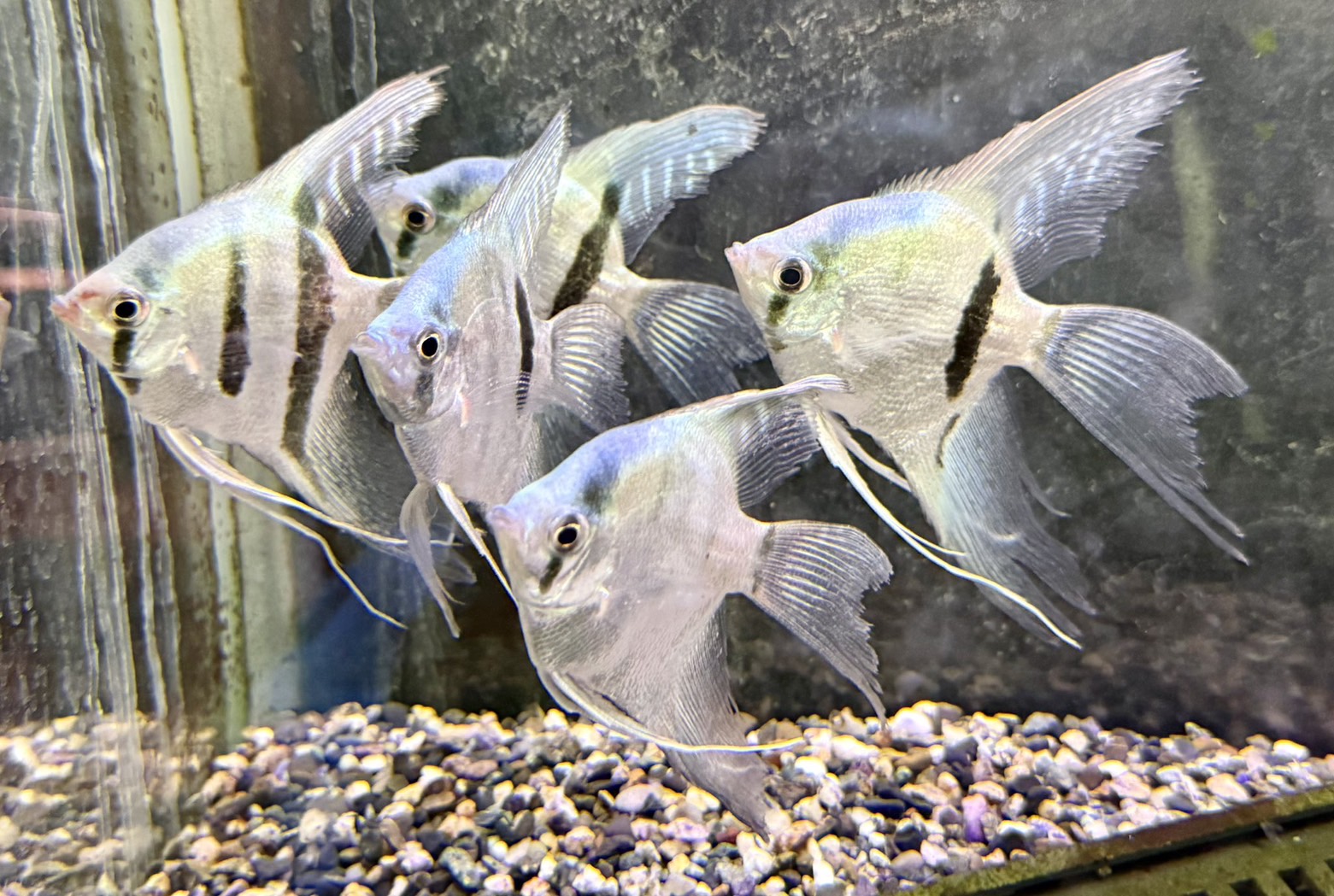 透き通るようなブルーシルバーの体色と、長く優雅に伸びるベール状のヒレが魅力の改良エンゼルフィッシュです。光の当たり方で淡いブルーが美しく輝き、ヒレを大きく広げて泳ぐ姿は非常に優雅で水槽内でもひときわ目を引きます。群れで泳がせることで存在感がさらに際立ちます。