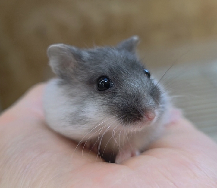 白とブラックグレーが美しく混ざり合う、個性的な模様が魅力のジャンガリアンハムスター(ブラックマール)です🐾