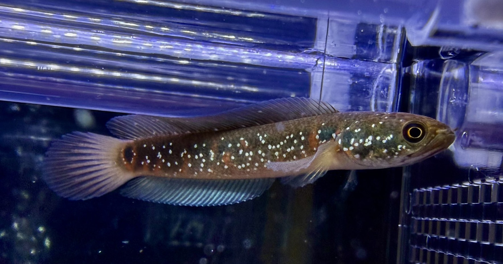 体側に散りばめられたラメ状のスポットと、尾部に入る鮮やかなレッド発色が魅力の美麗スネークヘッドです。深みのあるブラウン〜ダークグリーンの体色に、成長とともに赤味が強くなり、ヒレや尾筒周りの発色が際立ちます。光の当たり方で煌めくスポット模様は非常に観賞価値が高く、コレクション性にも優れた一種です。