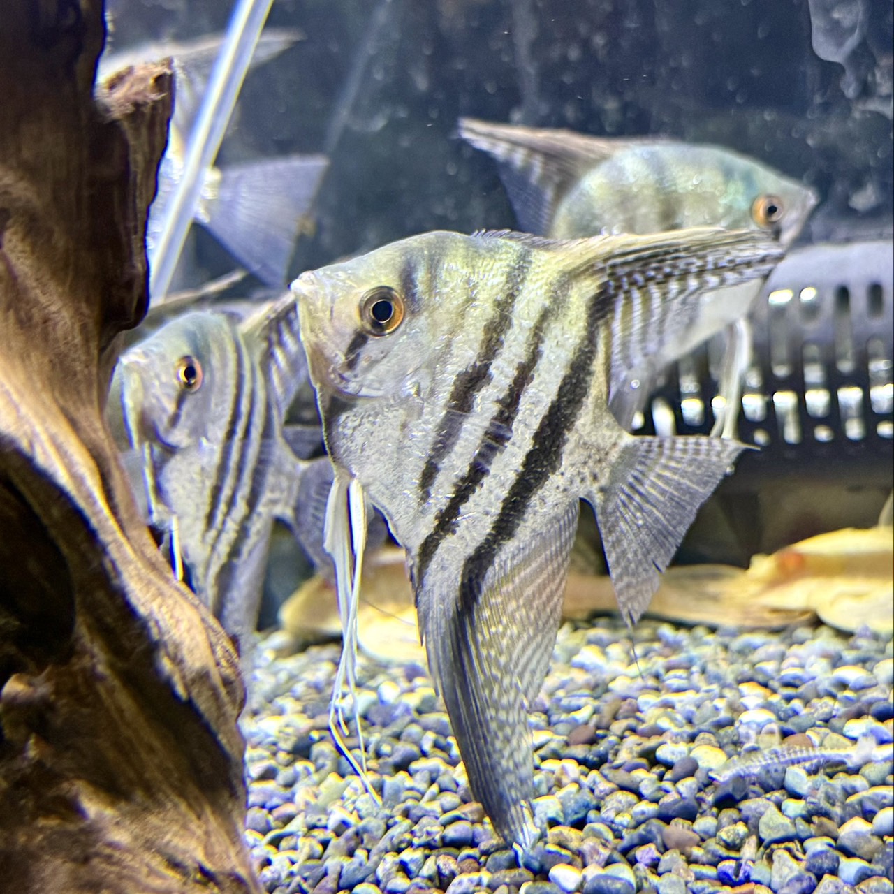 高い体高と鋭く伸びる背ビレ・腹ビレが特徴の、迫力あるワイルド系エンゼルフィッシュです。シルバーの体色にくっきりと入るブラックバンドが美しく、優雅さと野性味を兼ね備えた存在感抜群の一種です。通常のエンゼルよりも体高が出やすく、成長すると圧倒的なシルエットを楽しめます。