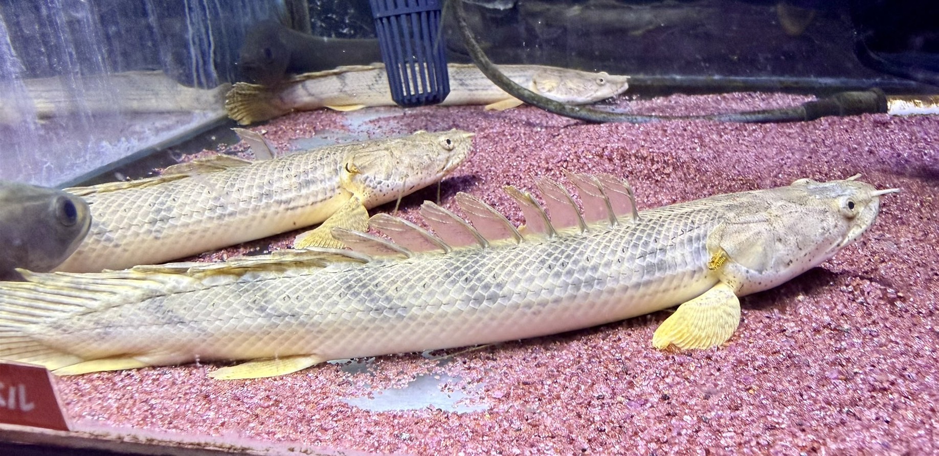 ポリプテルスの中でも大型に成長する人気種ビチャーです。幅広で力強い頭部と、重厚感のある鱗並びが特徴で、背ビレを立てた姿は迫力満点です。成長途中の20〜25cmサイズは体格もしっかりしており、これからさらに風格が増していく段階の個体です。