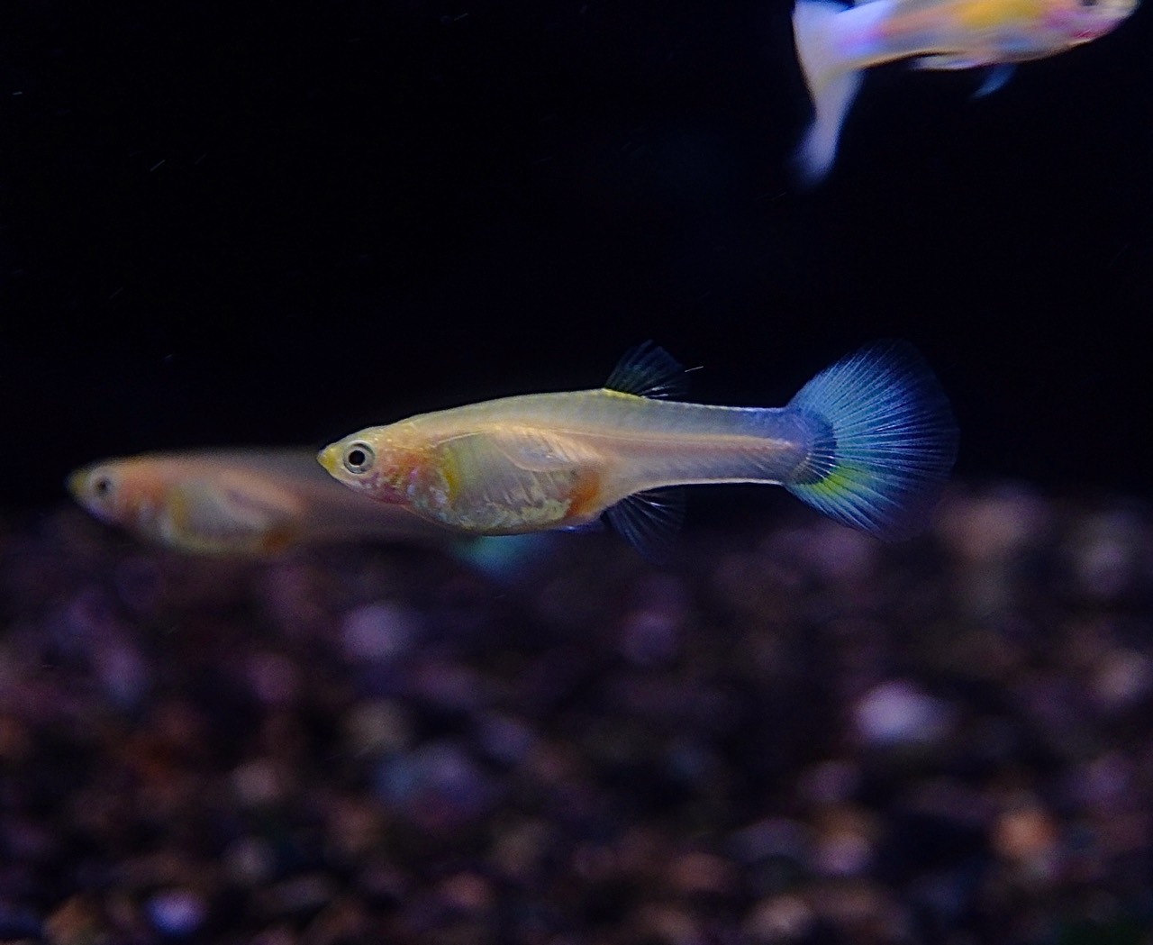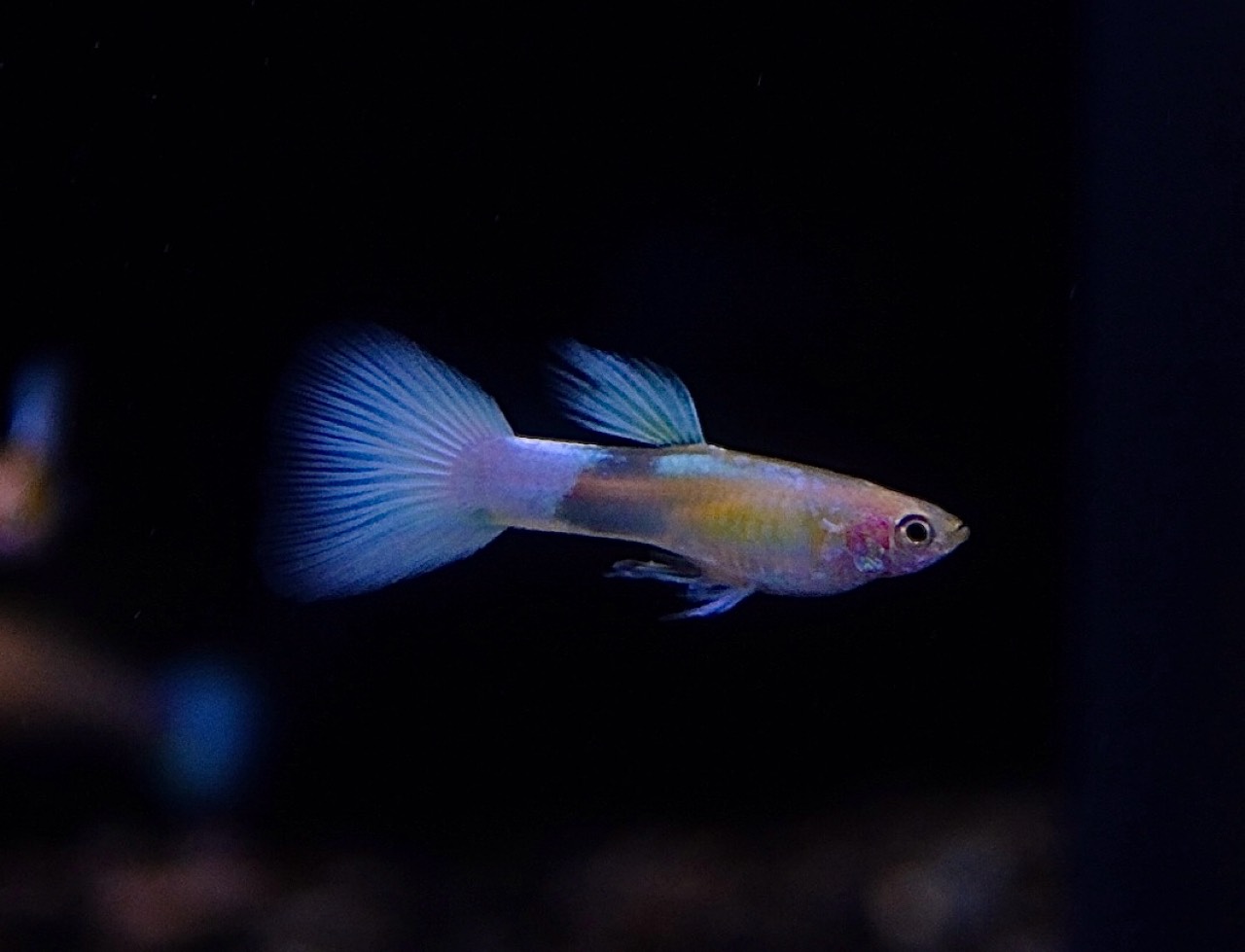 体色は透き通るようなホワイト〜プラチナカラーで、光の当たり方によってゴールドや淡いブルーの輝きが浮かび上がる上品な美しさが魅力です。国産血統ならではの体型の整いとコンディションの良さもポイントで、グッピーらしい華やかさと清楚な雰囲気を兼ね備えています。