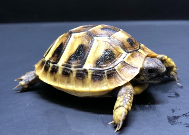 ヒガシヘルマンリクガメは、黄色と黒のコントラストがはっきりした甲羅模様が特徴で、リクガメの中でも特に観賞性の高い人気種です。