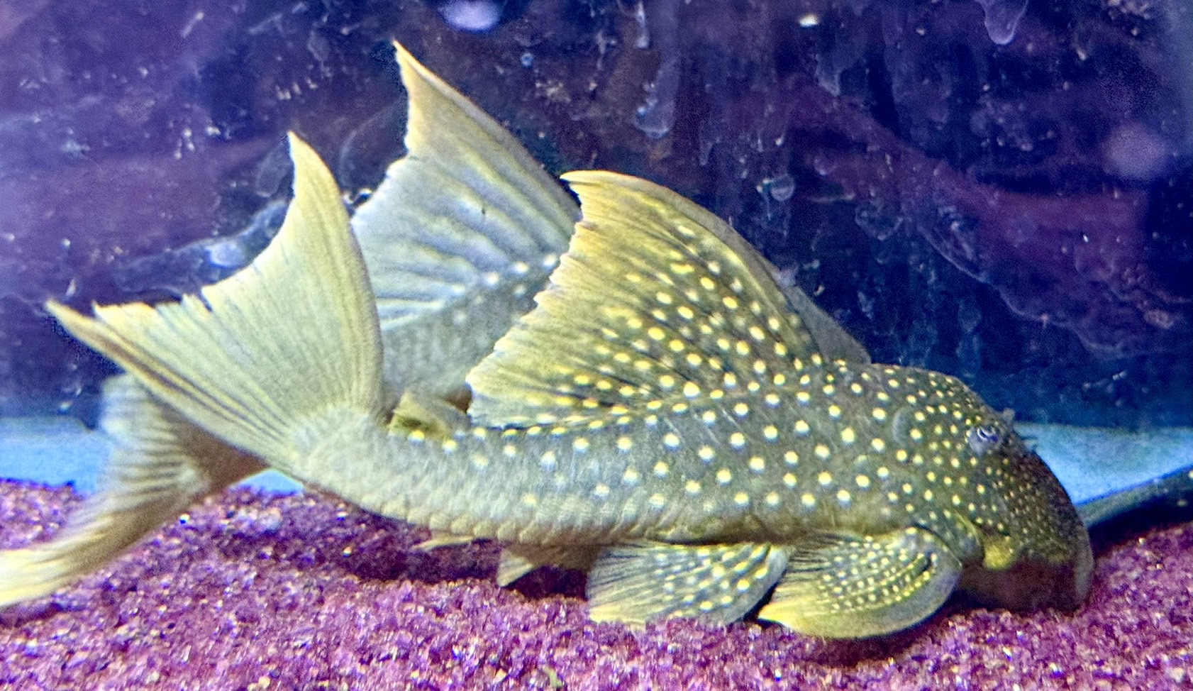 鮮やかなレモンイエローのフィンと、全身に散りばめられたスポット模様が美しい人気ペコルティア系プレコのワイルド個体です。ヒレの発色が特に魅力的で、遊泳時やフィンを広げた際の存在感は抜群。水槽内でも良く動き、観賞価値の高い一匹です。