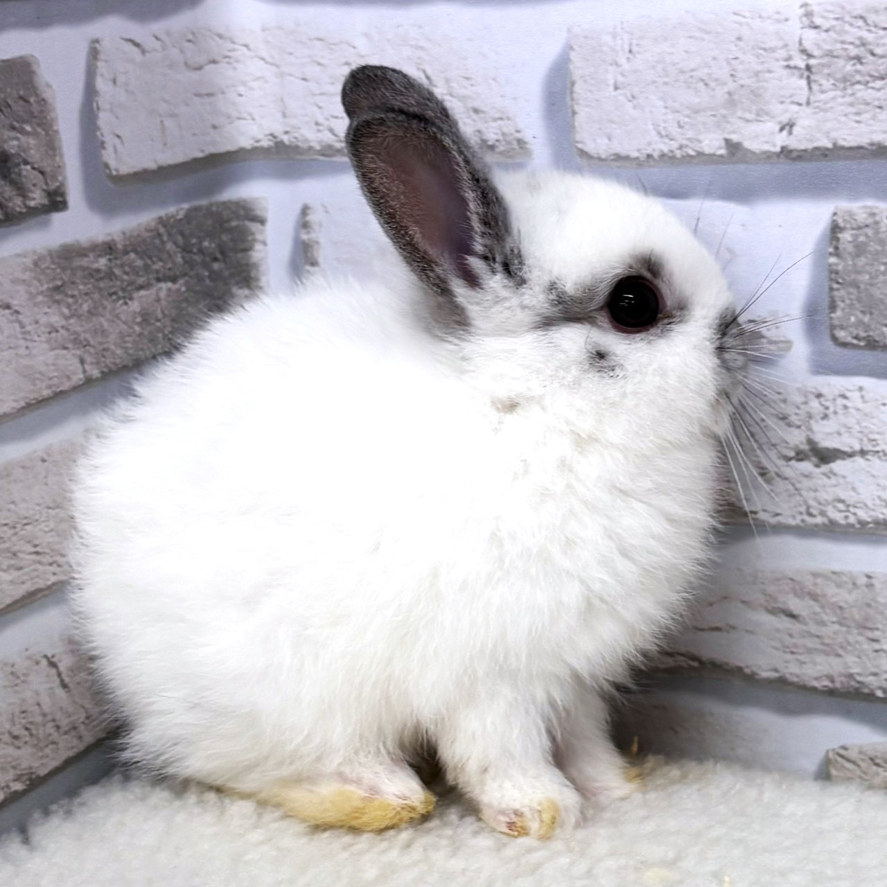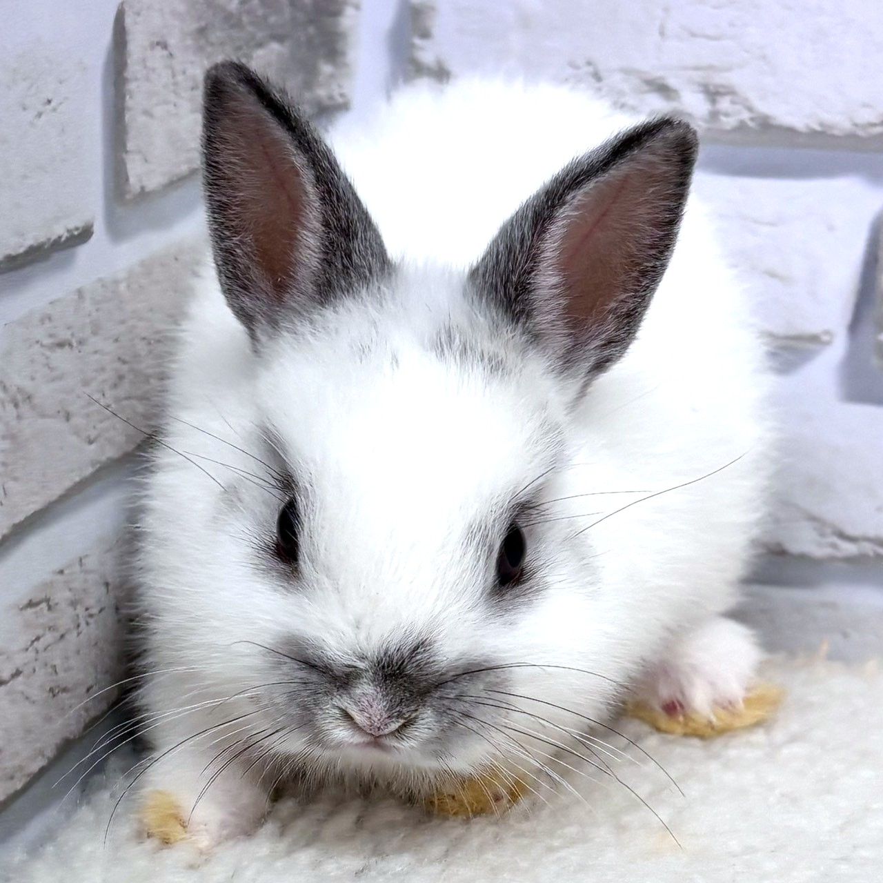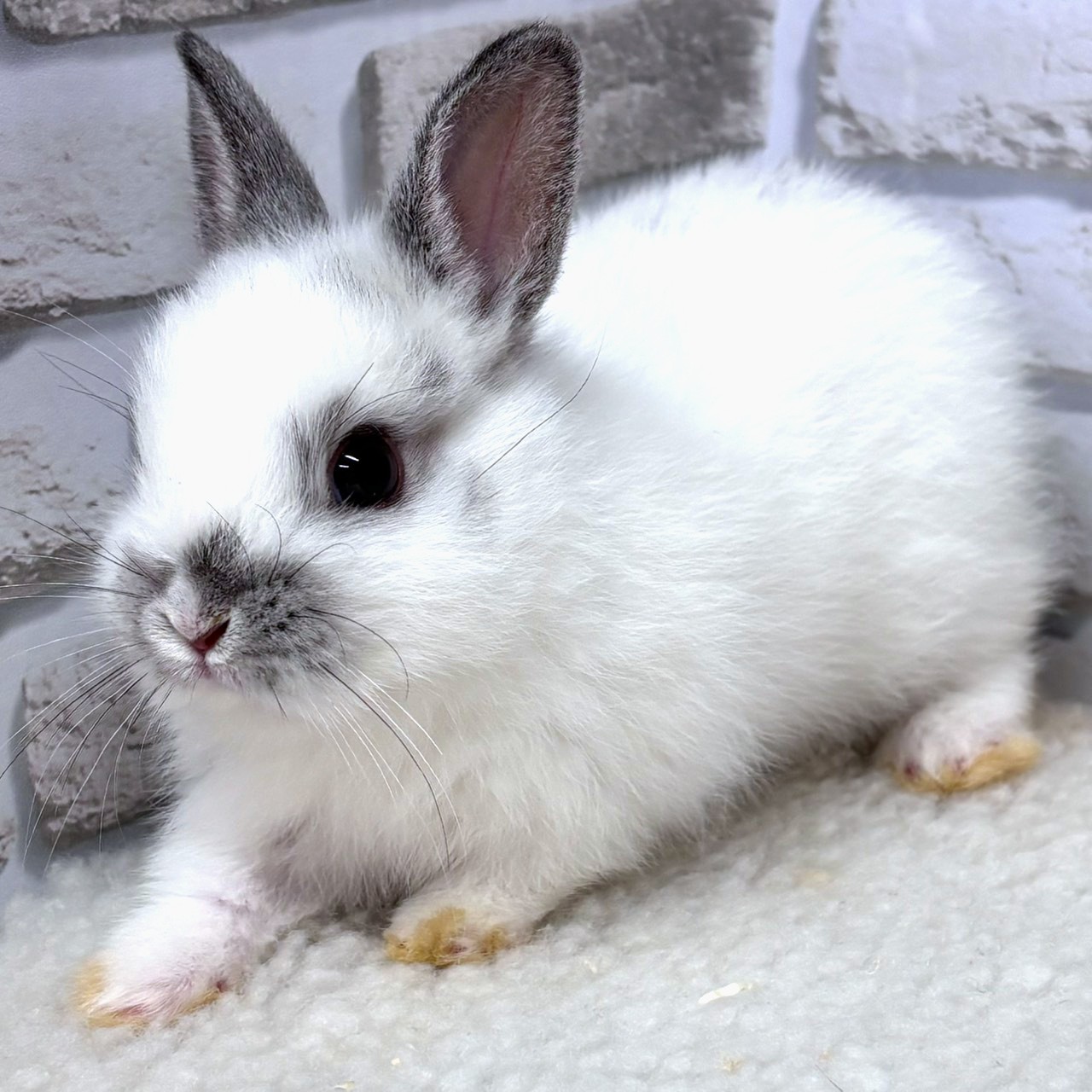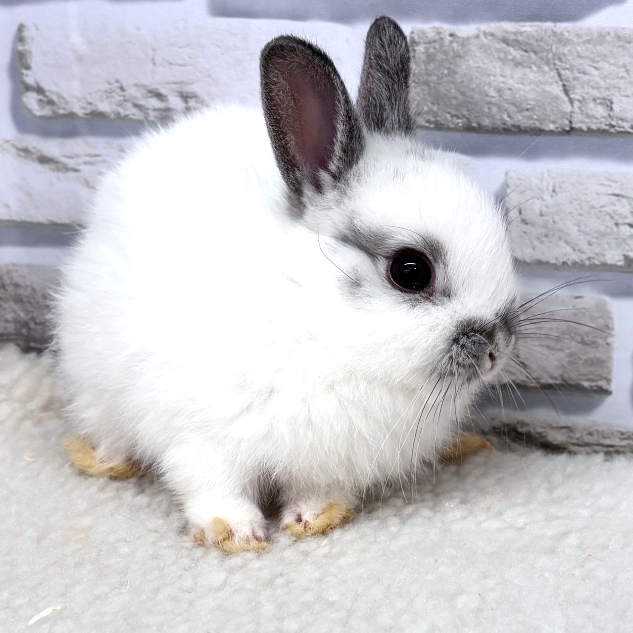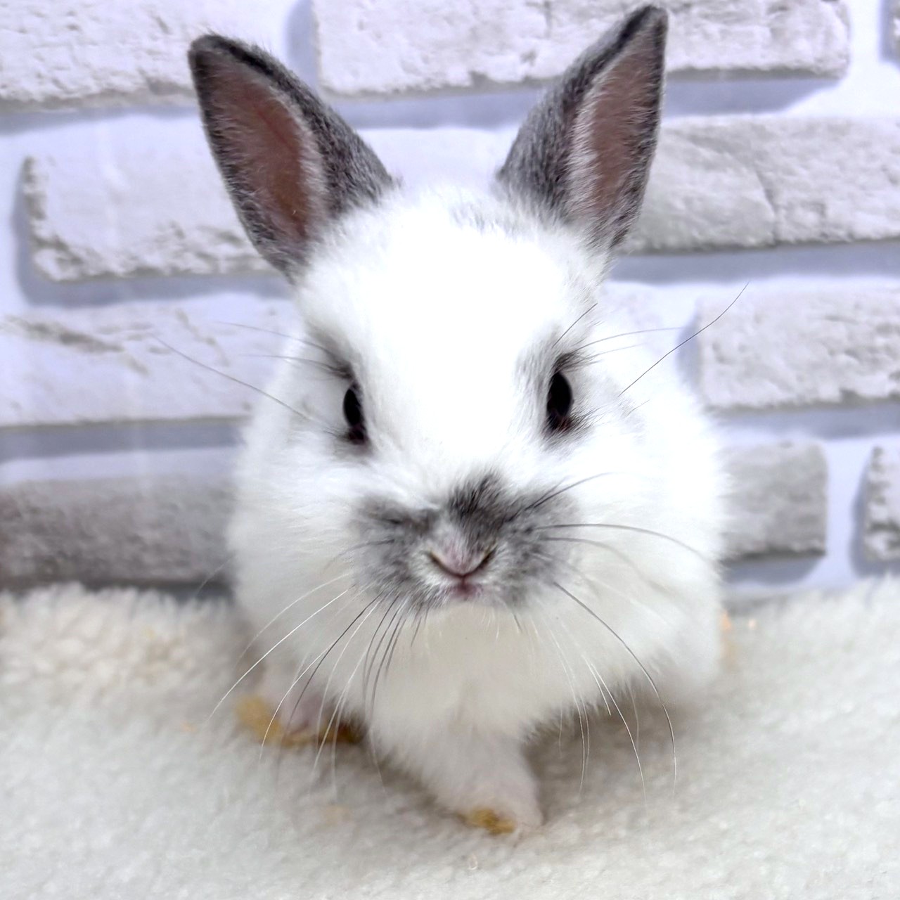 白い被毛に、耳先やお顔まわりのグレーのポイントがきれいに入ったネザーランドドワーフです✨。