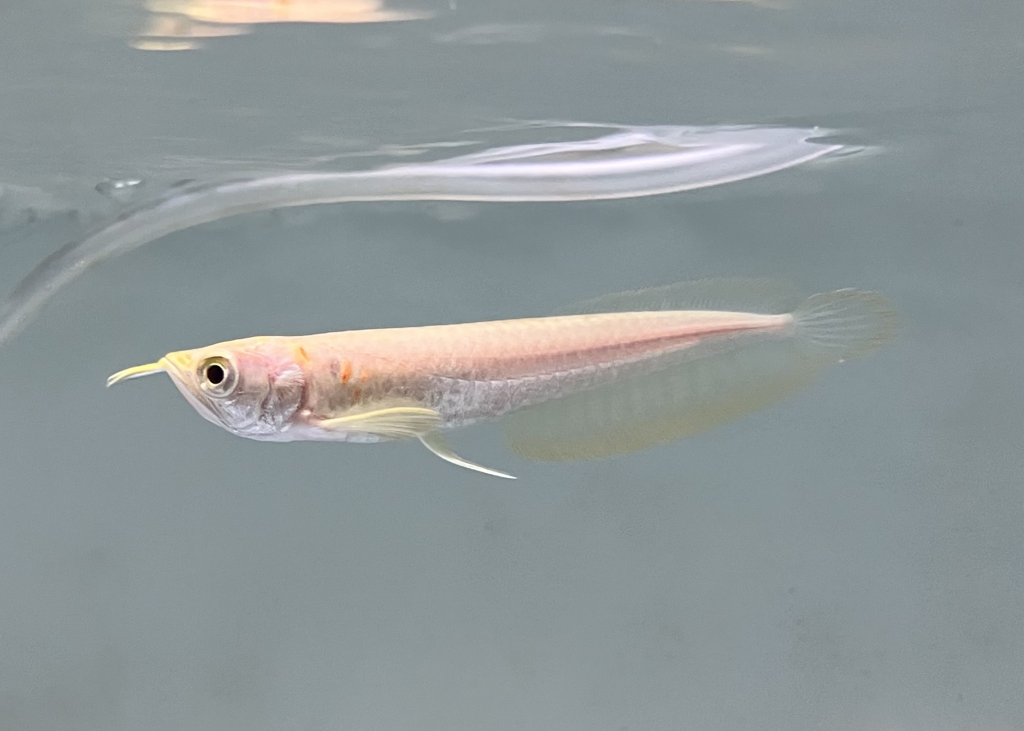 通常のシルバーアロワナとは異なるアルビノ特有の淡い輝きがあり、