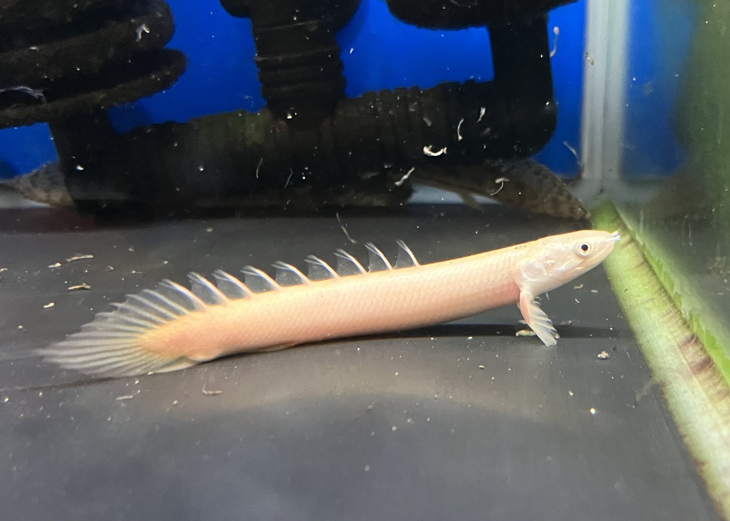 背中に並ぶ小さな背ビレと細長い体型は古代魚ならではの魅力。