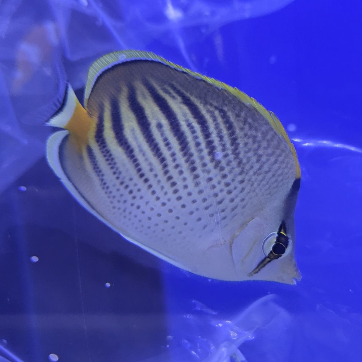 体側に入るドット(点)とダッシュ(線)の模様が特徴的なチョウチョウウオ。