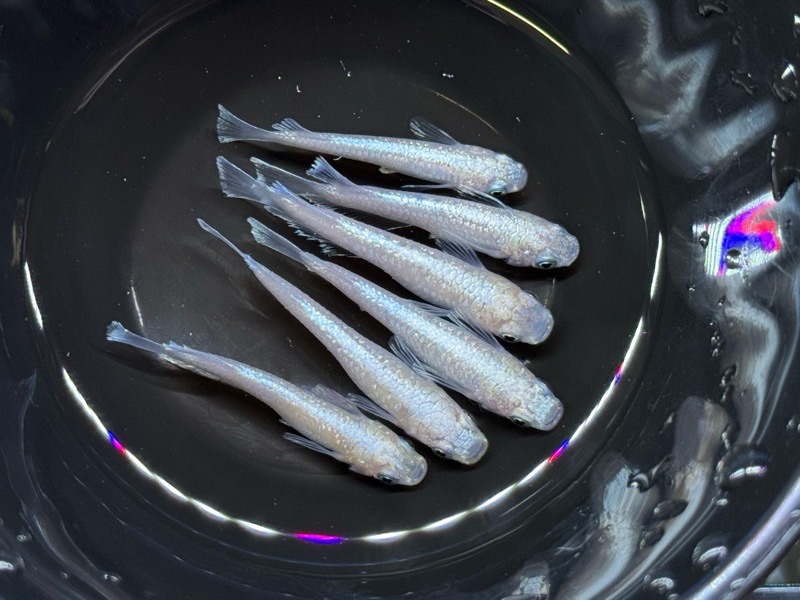 王華×デーンモルフォ由来の血統から作出された、白〜淡色ベースにラメ体外光が乗る美しい改良メダカ。