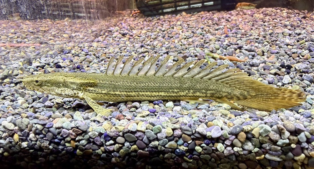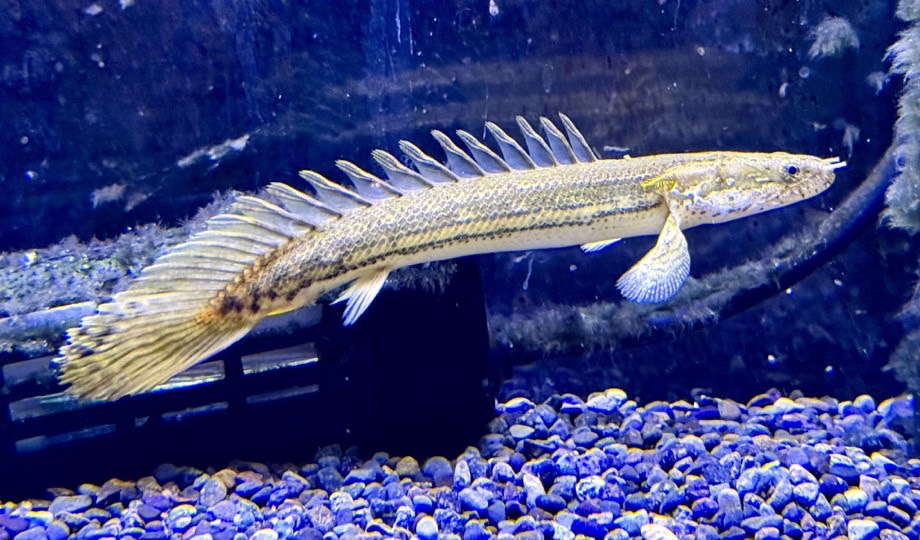 圧倒的な存在感と野性味あふれる風格を持つポリプテルス最大級種。長く伸びる体と鋭い顔つき、並ぶ背ビレが古代魚らしい迫力を演出します。成長すると水槽内でも主役級の存在となり、大型魚ファンにはたまらない人気種です。