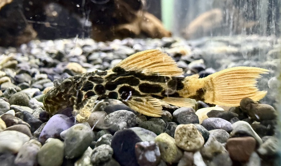 レオパード状のワイルドな体色に、鮮やかなオレンジフィンが映える非常に人気の高いトリム系プレコです。ヒレの発色が強く、成長とともに迫力と存在感が増していく魅力的な種類。流木や石組みレイアウトとの相性が良く、底物水槽の主役としても楽しめます。やや縄張り意識はありますが、環境が整えば長期飼育も可能なコレクション性の高いプレコです。