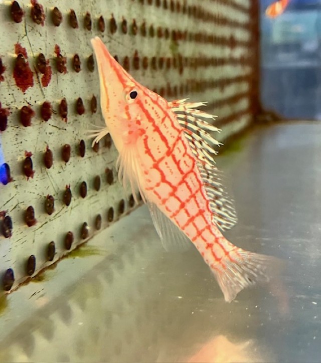 赤と白の格子模様が美しい人気の海水魚クダゴンベです。独特の体型とホバリングするような泳ぎ方が特徴で、水槽内でも観賞性の高い一匹です。現在の体長は約7~9cmです。