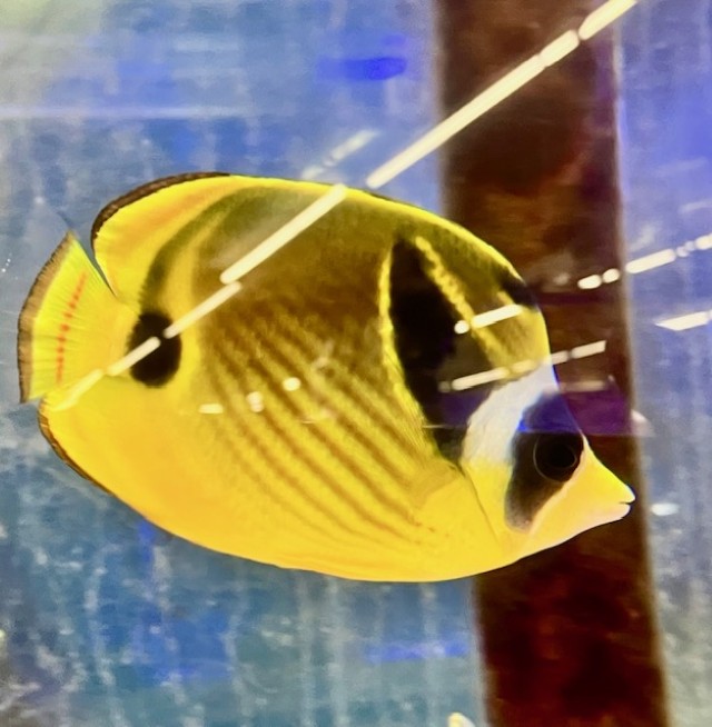 黄色のコントラストに白と黒のアクセントが映えるチョウハン(チョウチョウウオ)です。優雅に泳ぐ姿が美しく、海水水槽の主役としても人気の高い種です。現在の体長は約13~15cmとしっかりしたサイズです。
