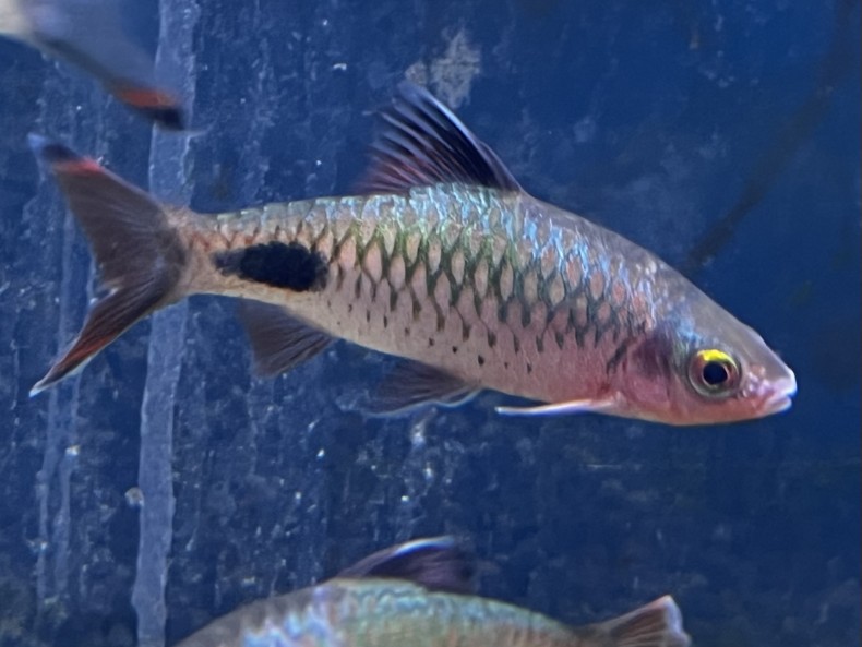 伸びるフィラメント状のヒレが美しいプンティウス・フィラメントーサのオス個体です。成熟するとヒレがより長く発達し、遊泳時のシルエットが非常に優雅になります。現在の体長は約9~12cmで見応えのあるサイズです。