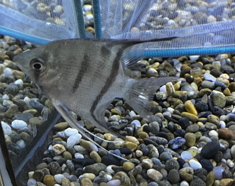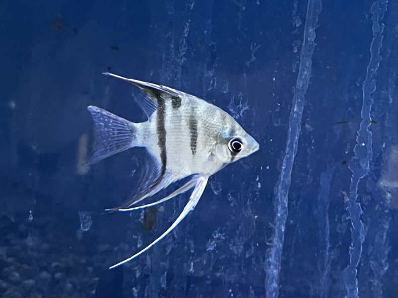 独特な模様と落ち着いた色合いが魅力のドゥメリリィエンゼル(ノボアイロン)です。成長に伴い体色や模様が変化していく過程も楽しめる人気種で、海水水槽のアクセントとしてもおすすめです。現在の体長は鰭込み約5~6㎝の若魚サイズです。