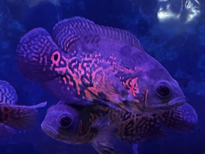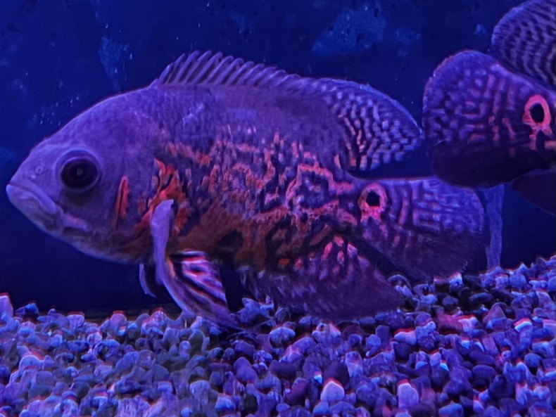 鮮やかな赤色が魅力のルビーレッドオスカーです。成長とともに発色がより濃くなり、迫力のある体型へと成長する人気の大型シクリッドです。人にも慣れやすく、餌やりなどの反応も楽しめる観賞性の高い魚です。