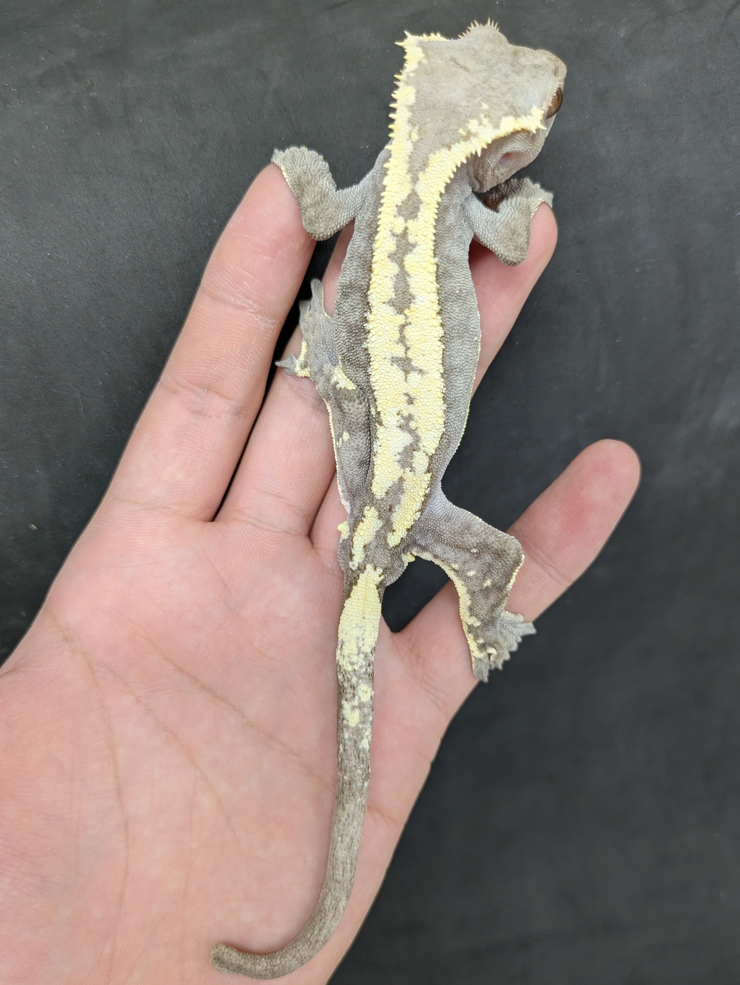 グレーを基調とした落ち着いたボディに、クリームカラーの背中ラインが美しく映えるセーブルタイプのクレステッドゲッコー🦎