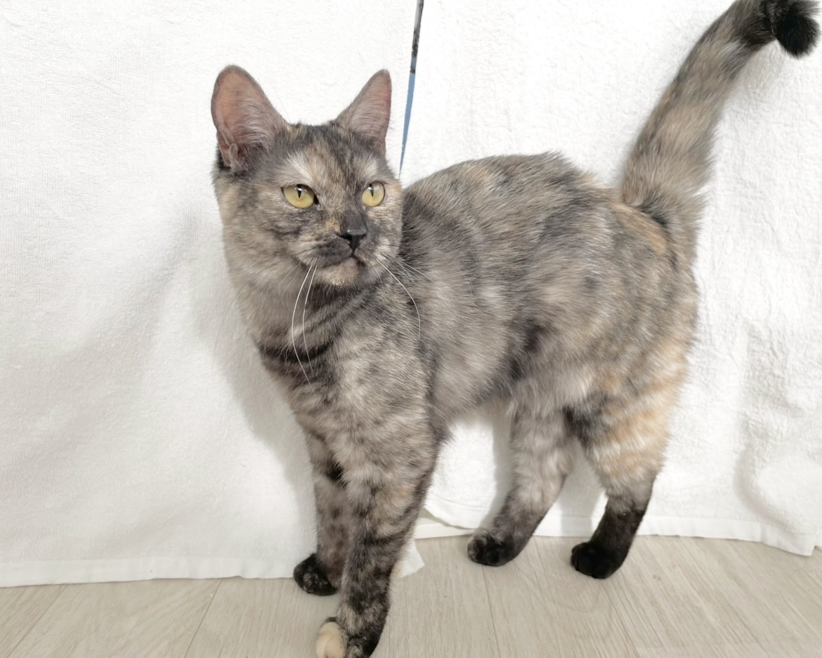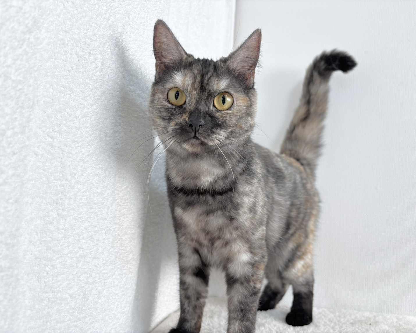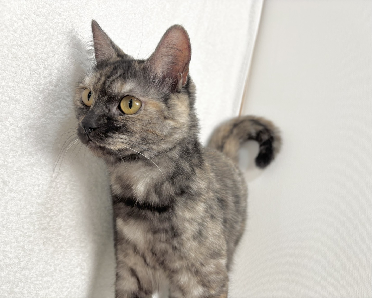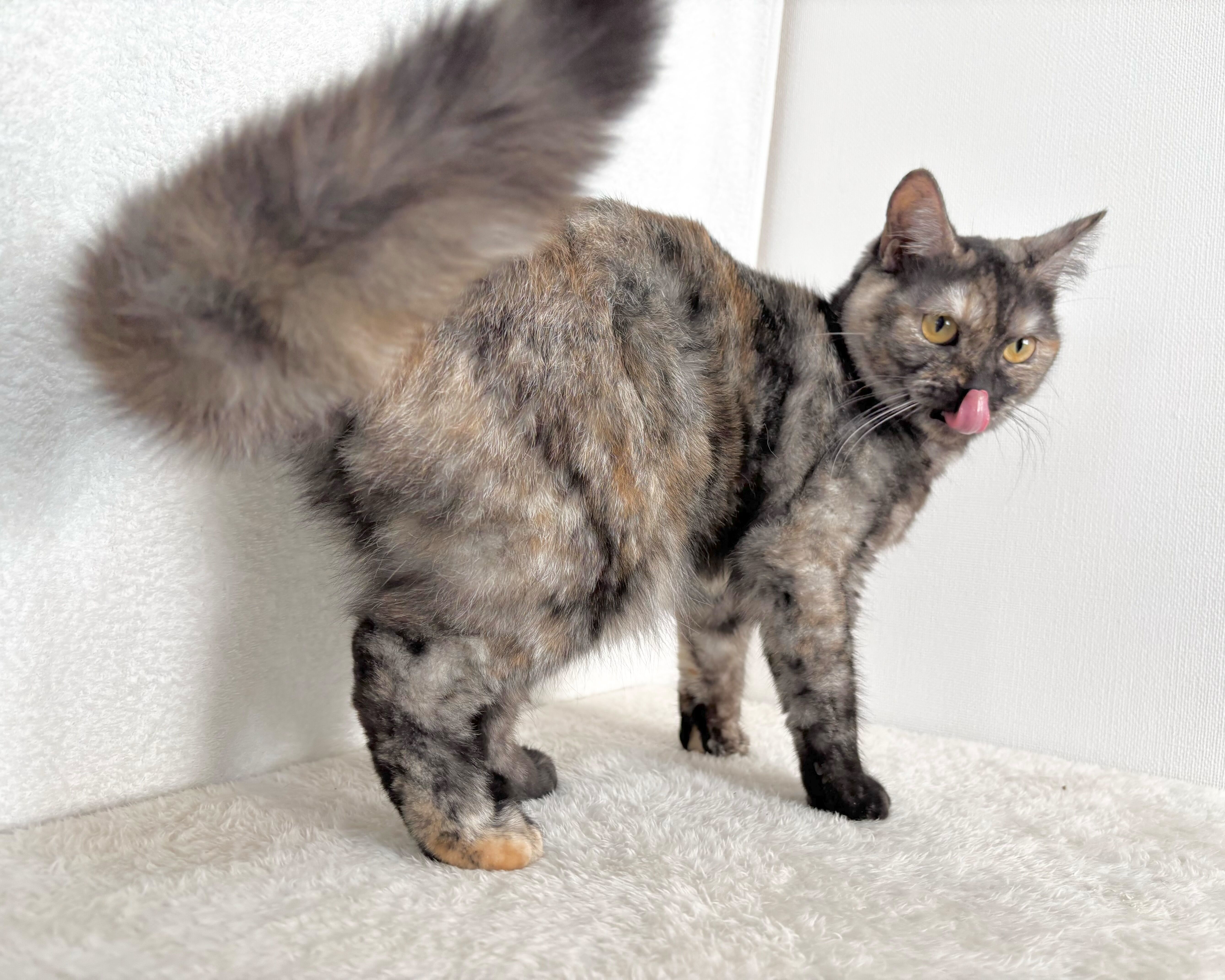 美しいトーティシェル(サビ柄)の被毛が目を惹く、マンチカンの女の子🐱💕