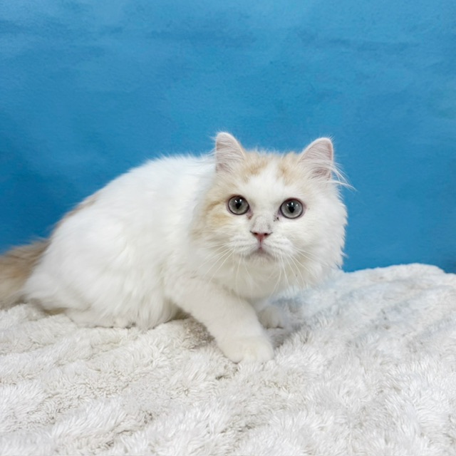 ホワイトベースにクリームカラーがほんのり入った毛並みと、澄んだブルーグリーンのおめめが魅力的。