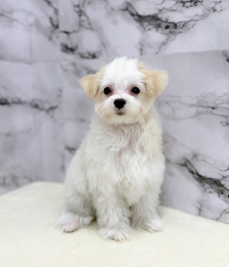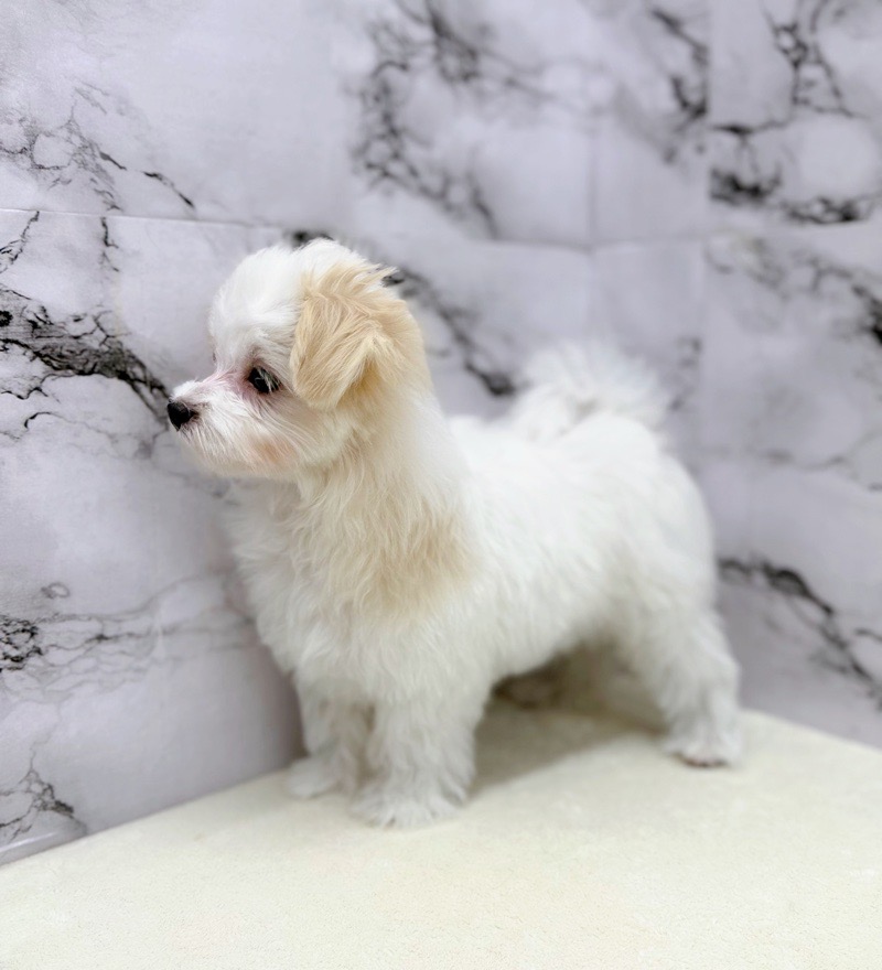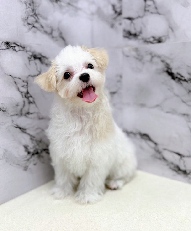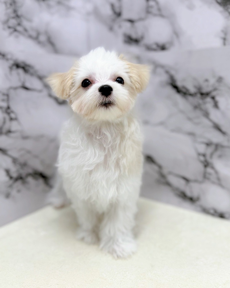 雪のような白さと、ふわふわな被毛が印象的なマルチーズの女の子。
