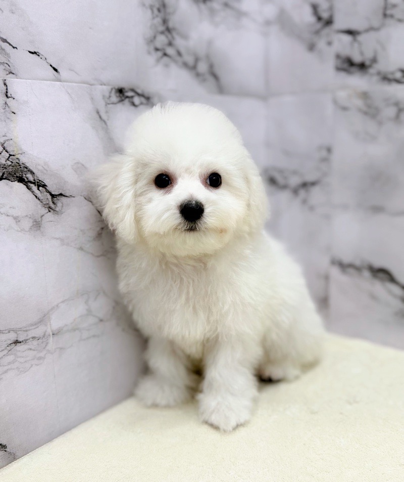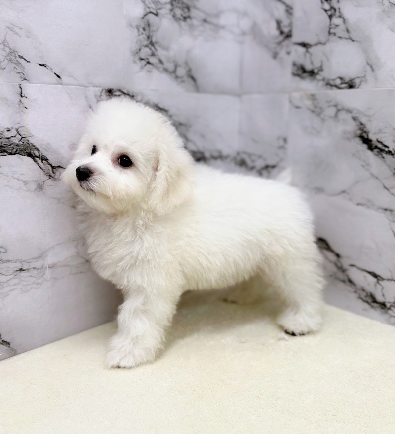 柔らかでやわらかな巻き毛に覆われたビションフリーゼの男の子。
