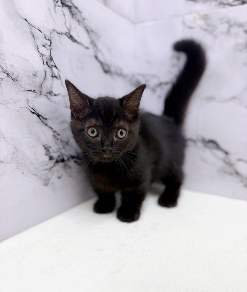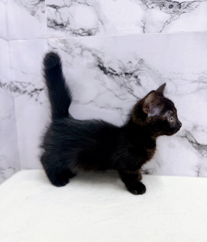 表情豊かな瞳と、つややかで濃い被毛に包まれたマンチカンの男の子。短くすらりと床に近い脚で、ちょこちょこと動くその姿は愛嬌がたっぷり。