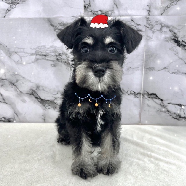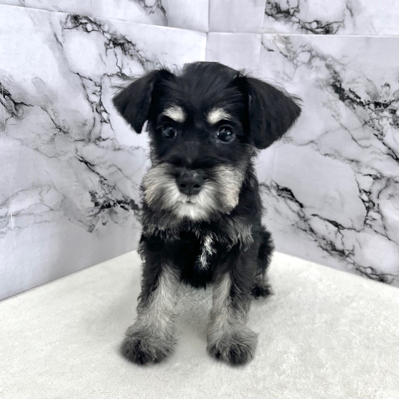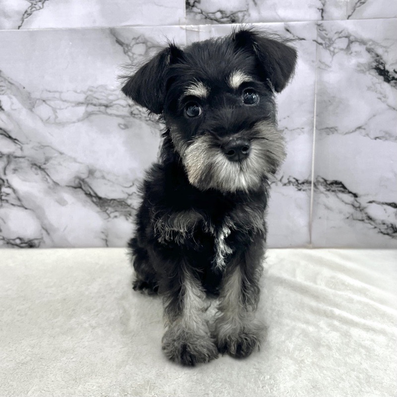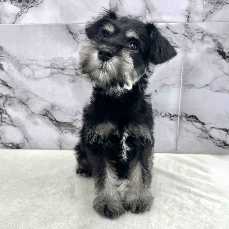 つぶらな瞳とふわっとした口まわりが愛らしい、ミニチュアシュナウザーの女の子。