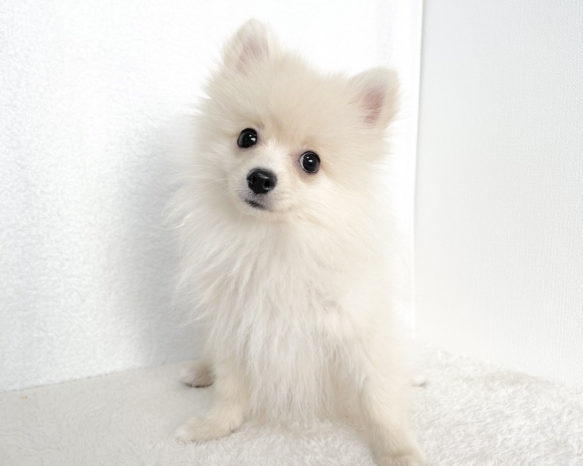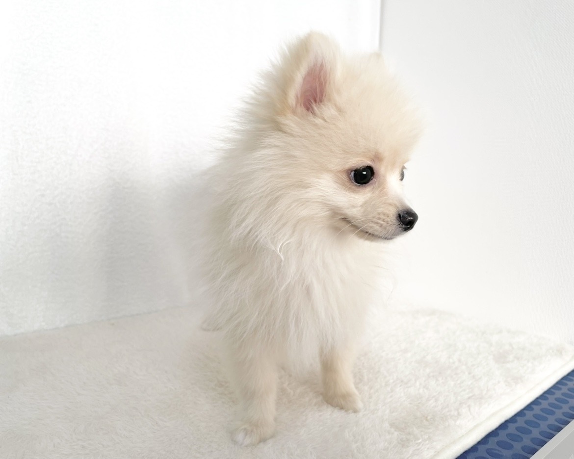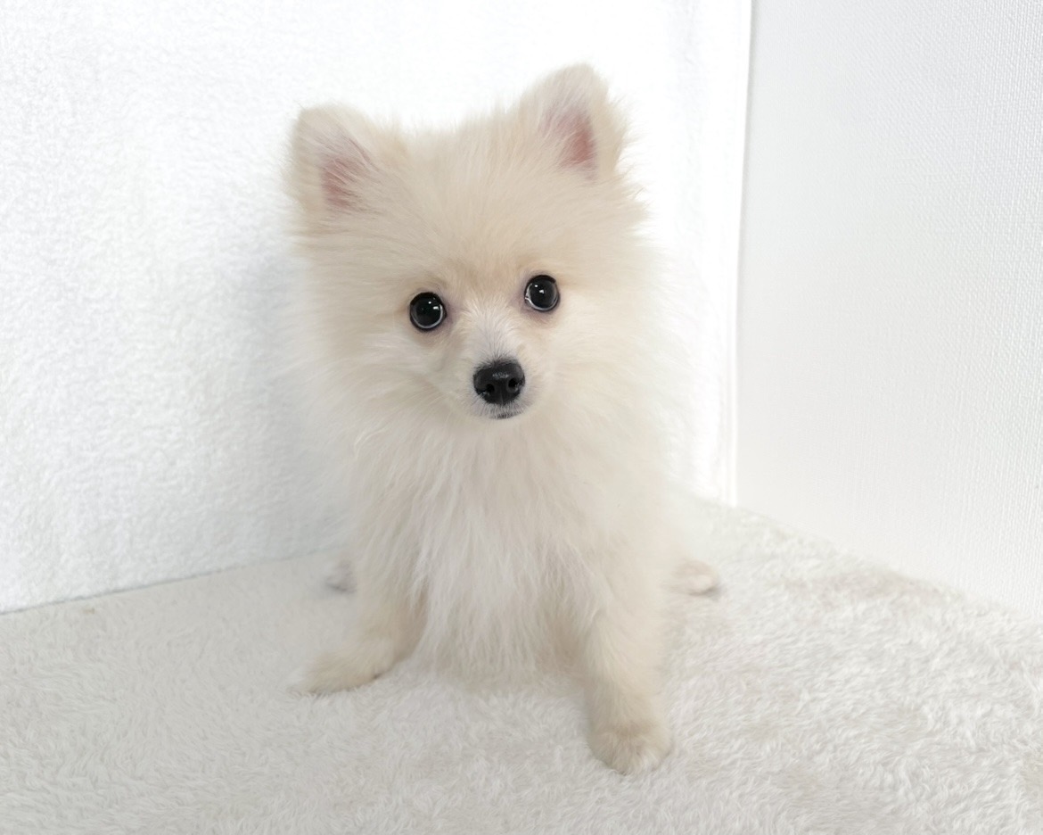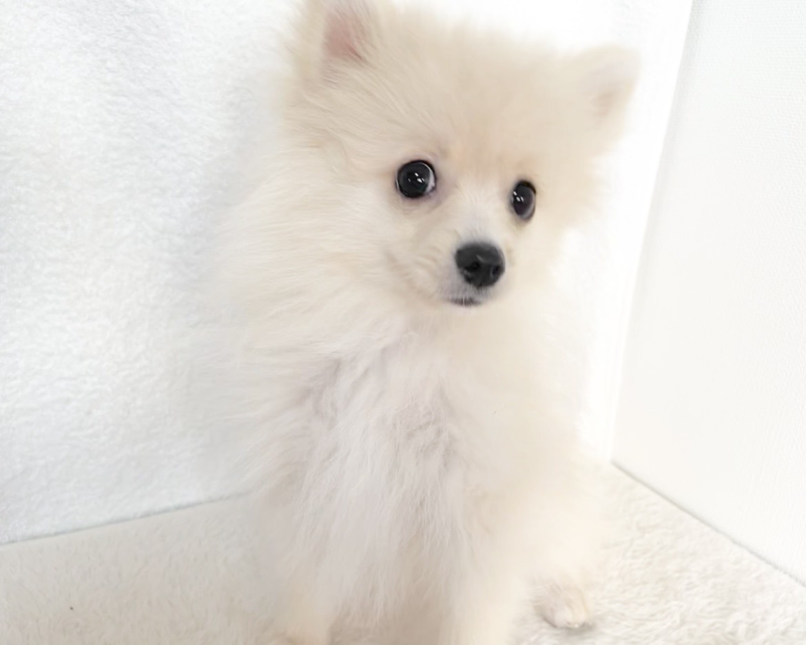 ふわふわのクリームカラーがとても美しい、小さな小さなポメラニアンの男の子です。まるでぬいぐるみのような柔らかいフォルムと大きなうるうるおめめが特徴で、初対面の方でも思わず抱きしめたくなる可愛さです。