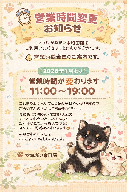 かねだい本町田店、犬猫コーナーは2026年1月より営業時間が変わります。