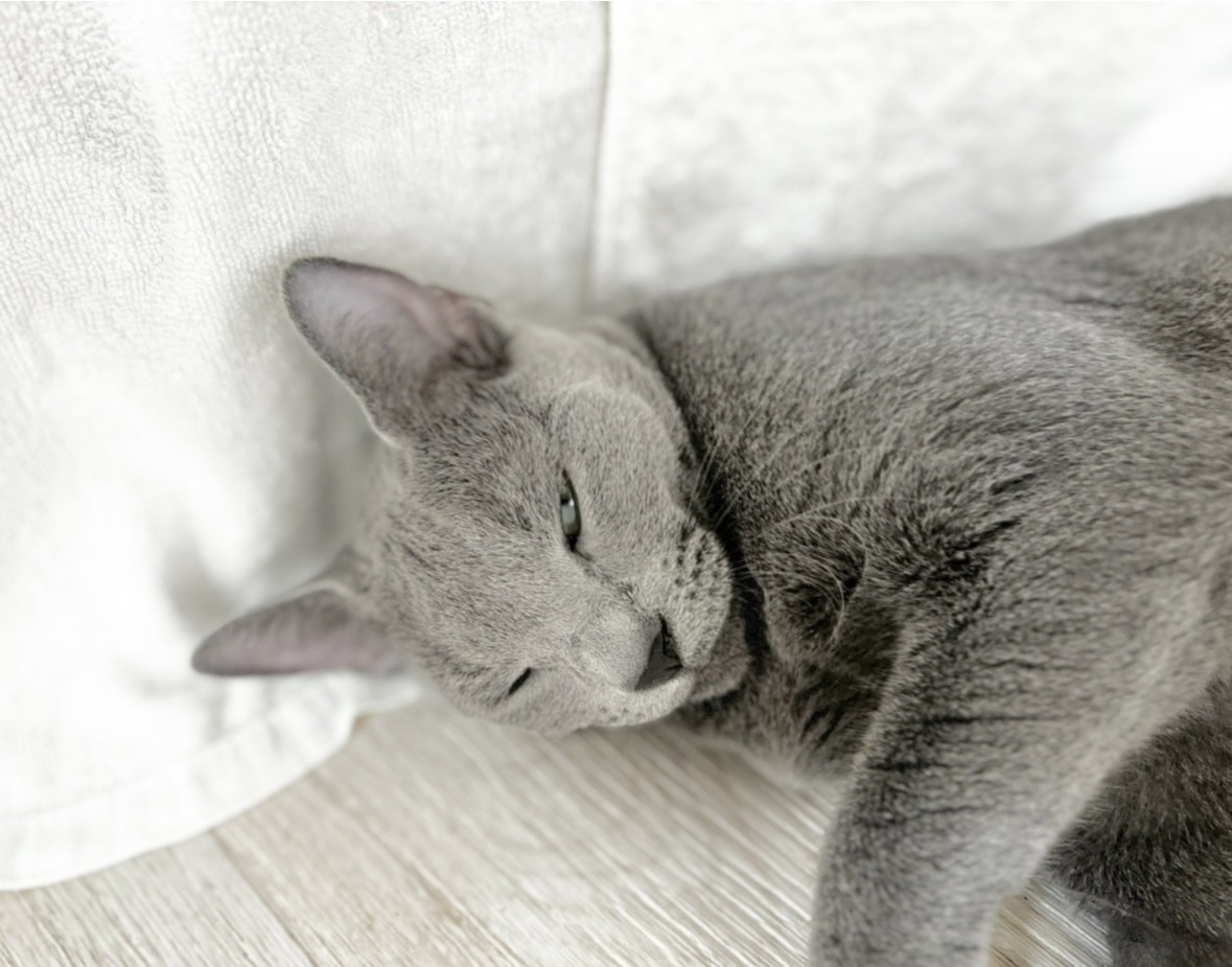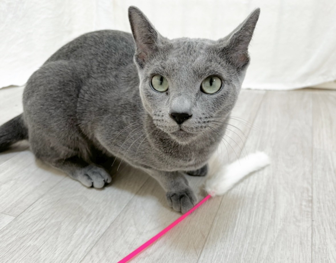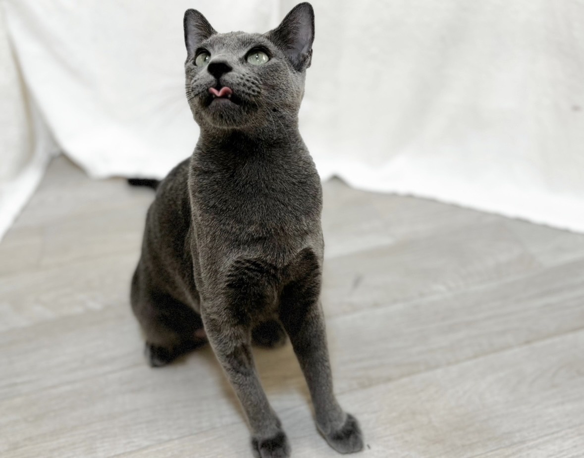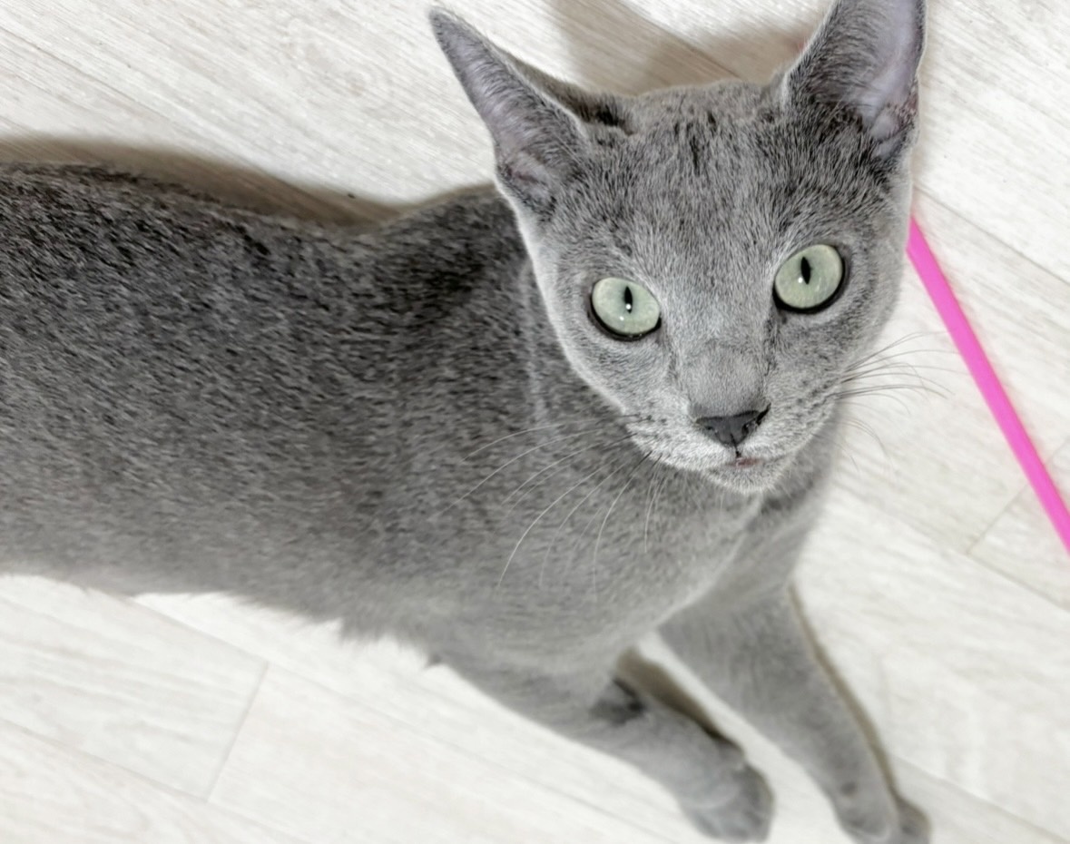 ロシアンブルーらしい上品さと、驚くほど人懐っこい甘えん坊な性格をあわせ持った女の子です。発色のとても美しいブルーの被毛と、華奢でしなやかな体つきが印象的で、動くたびにその美しさが際立ちます。
