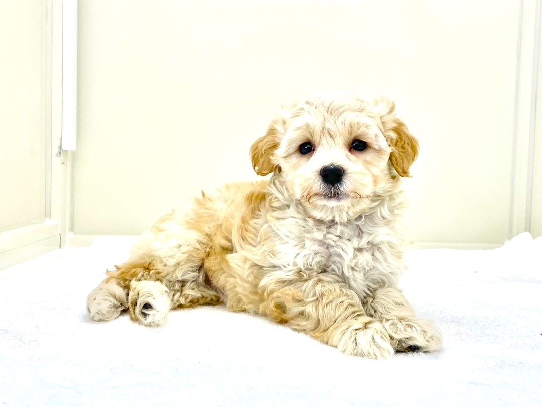 毛色はアプリコット&ホワイト。やさしくて明るい色合いがとても華やかで、まるでお日さまの光をまとっているかのような印象。どこにいても自然と目を引く、太陽タイプの女の子です♪