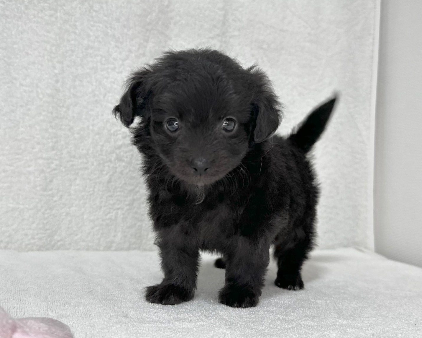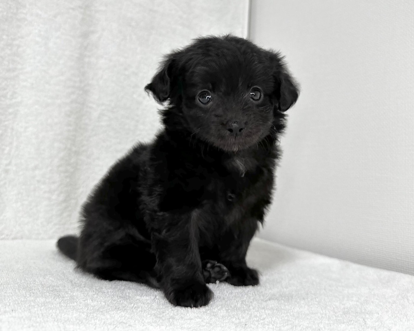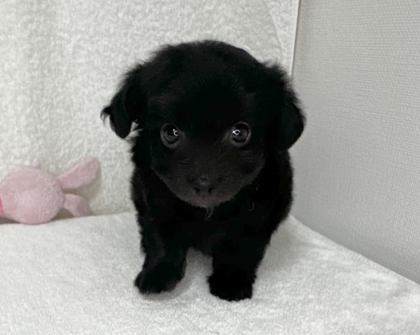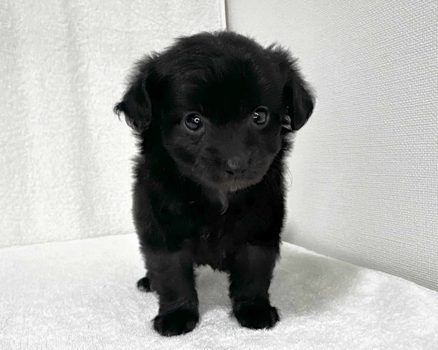 つやのあるブラックの被毛がとても美しく、シンプルながら存在感のあるマルチーズ×ポメラニアンの男の子です。