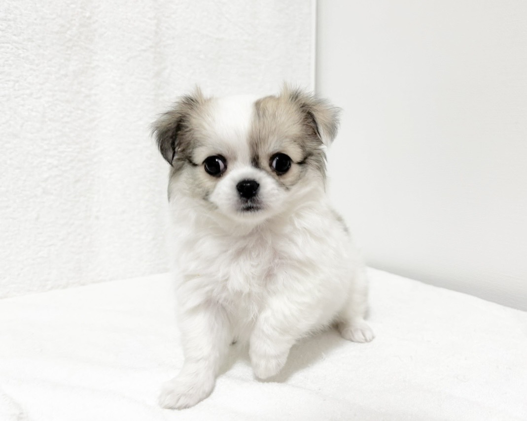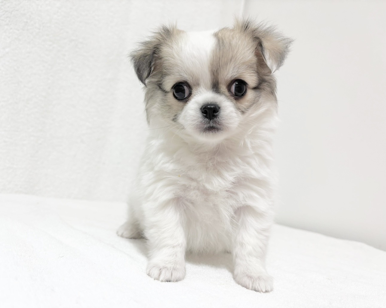 ホワイトをベースにレッドが入った、明るくやさしい印象の毛色が魅力的なチワワの女の子です。