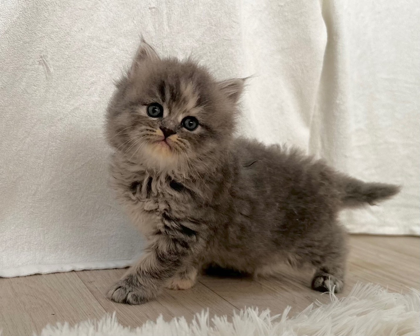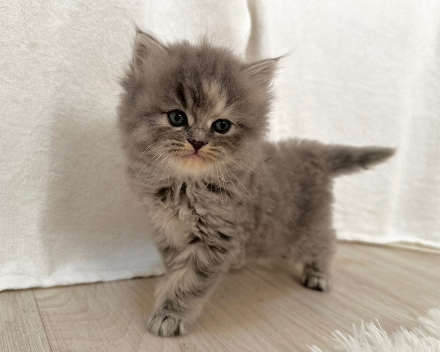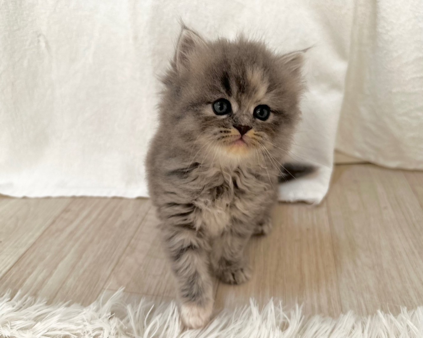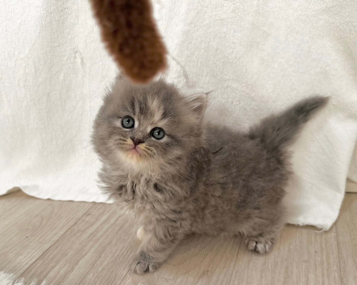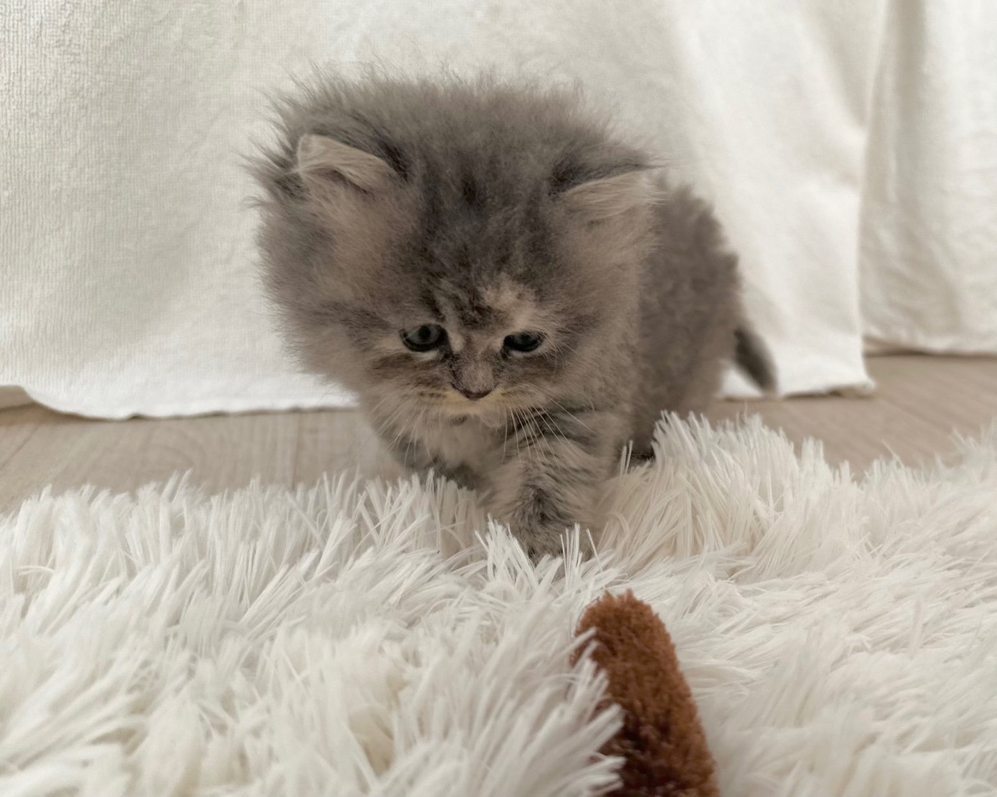ふわふわとした被毛に包まれた丸い体つきと、少し首をかしげるような表情、まんまるの瞳がこの子の大きな魅力です。遊び道具に目を留め、そっと手を伸ばす姿からは、穏やかさの中にしっかりとした好奇心が育っていることが伝わってきます。