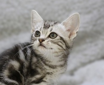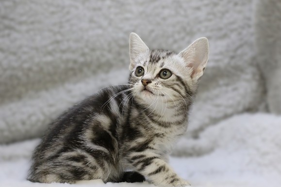 写真でも分かる、くっきり入ったシルバータビーの模様がとにかく映える男の子 ✨ 大きなお耳とまん丸おめめで、見上げる表情がとっても愛らしいです。短毛種ならではの扱いやすさも魅力で、お手入れは“なでなで”がご褒美タイムになりやすいタイプです 💖